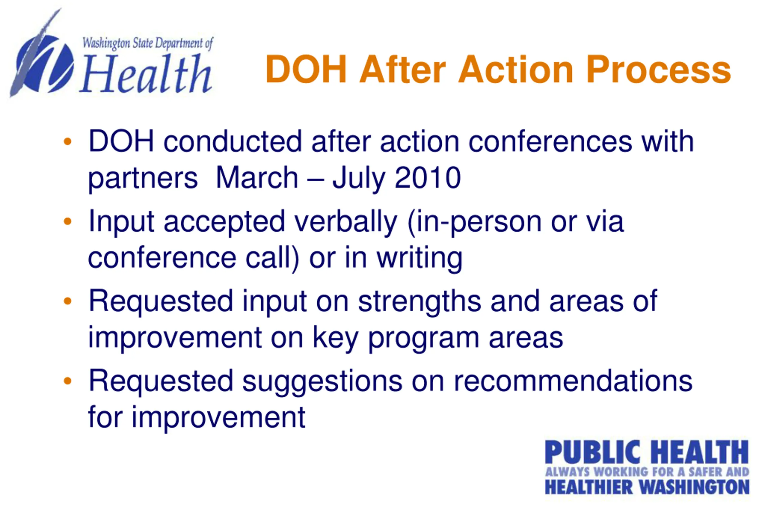 DOH After Action Process DOH conducted after action conferences with partners March July 2010 Input accepted verbally (in-person or via conference call) or in writing Requested input on strengths and areas of improvement on key program areas Requested suggestions on recommendations for improvement