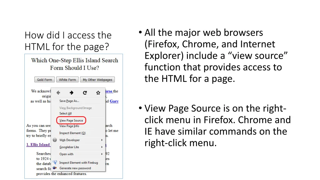 All the major web browsers (Firefox, Chrome, and Internet Explorer) include a view source function that provides access to the HTML for a page. How did I access the HTML for the page? View Page Source is on the right- click menu in Firefox. Chrome and IE have similar commands on the right-click menu.