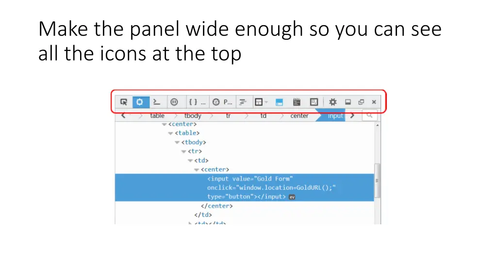 How to access the developer tools You can press [F12] to open the developer tools panel. [F12] opens the developer tools panel focused on the current page. You can right-click and select Inspect Element (Firefox and IE) or Inspect (Chrome). Inspect element opens the developer tools panel focused on the HTML element under the cursor, i.e., it s more specific.