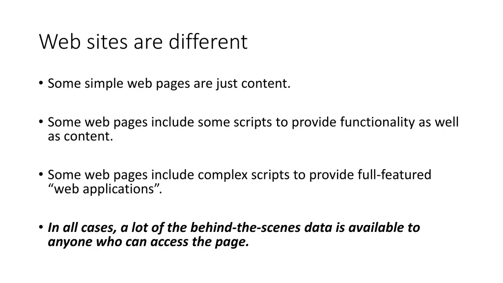 Web sites are different Some simple web pages are just content. Some web pages include some scripts to provide functionality as well as content. Some web pages include complex scripts to provide full-featured web applications . In all cases, a lot of the behind-the-scenes data is available to anyone who can access the page.