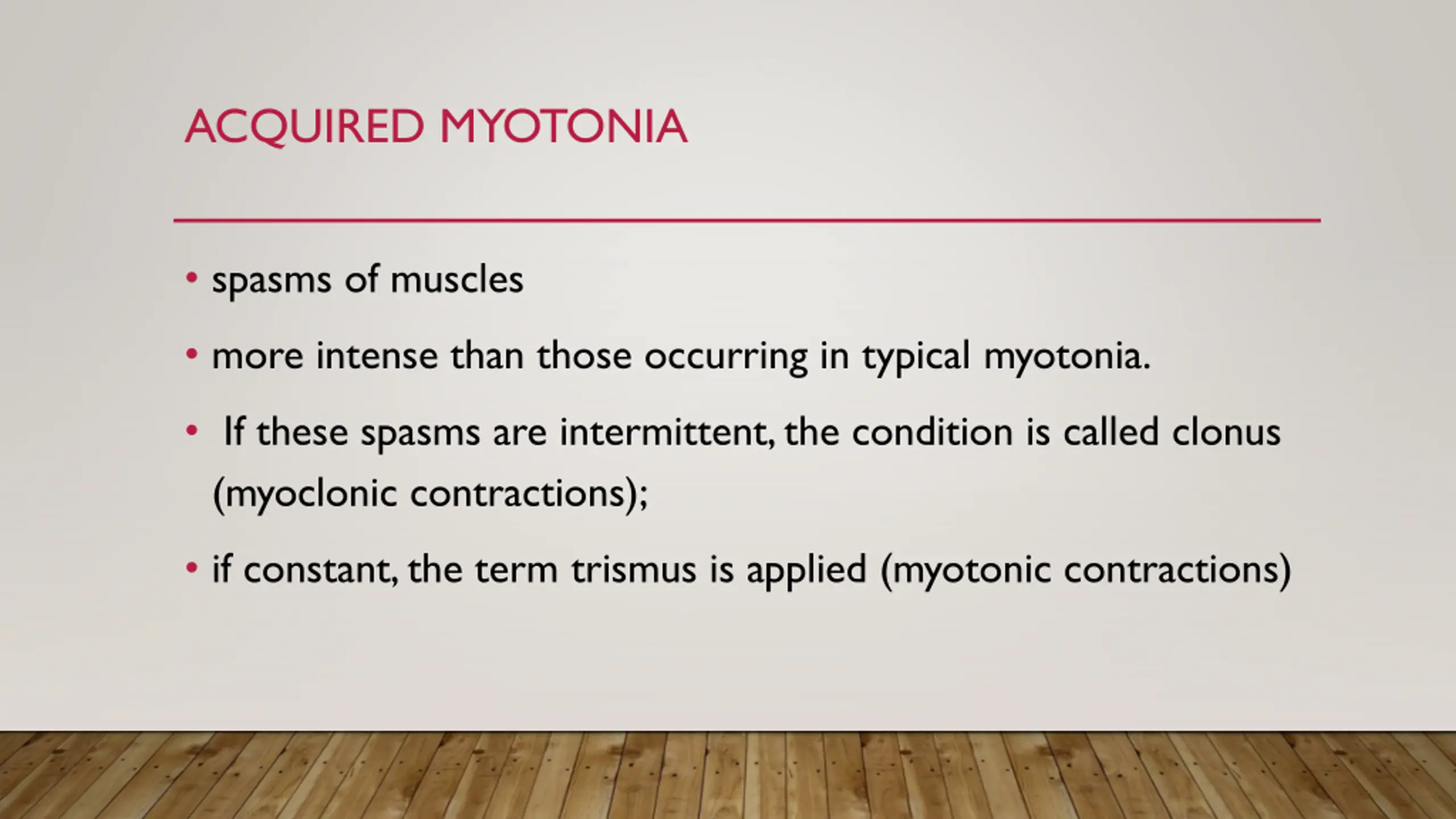 ACQUIRED MYOTONIA spasms of muscles more intense than those occurring in typical myotonia. If these spasms are intermittent, the condition is called clonus (myoclonic contractions); if constant, the term trismus is applied (myotonic contractions)