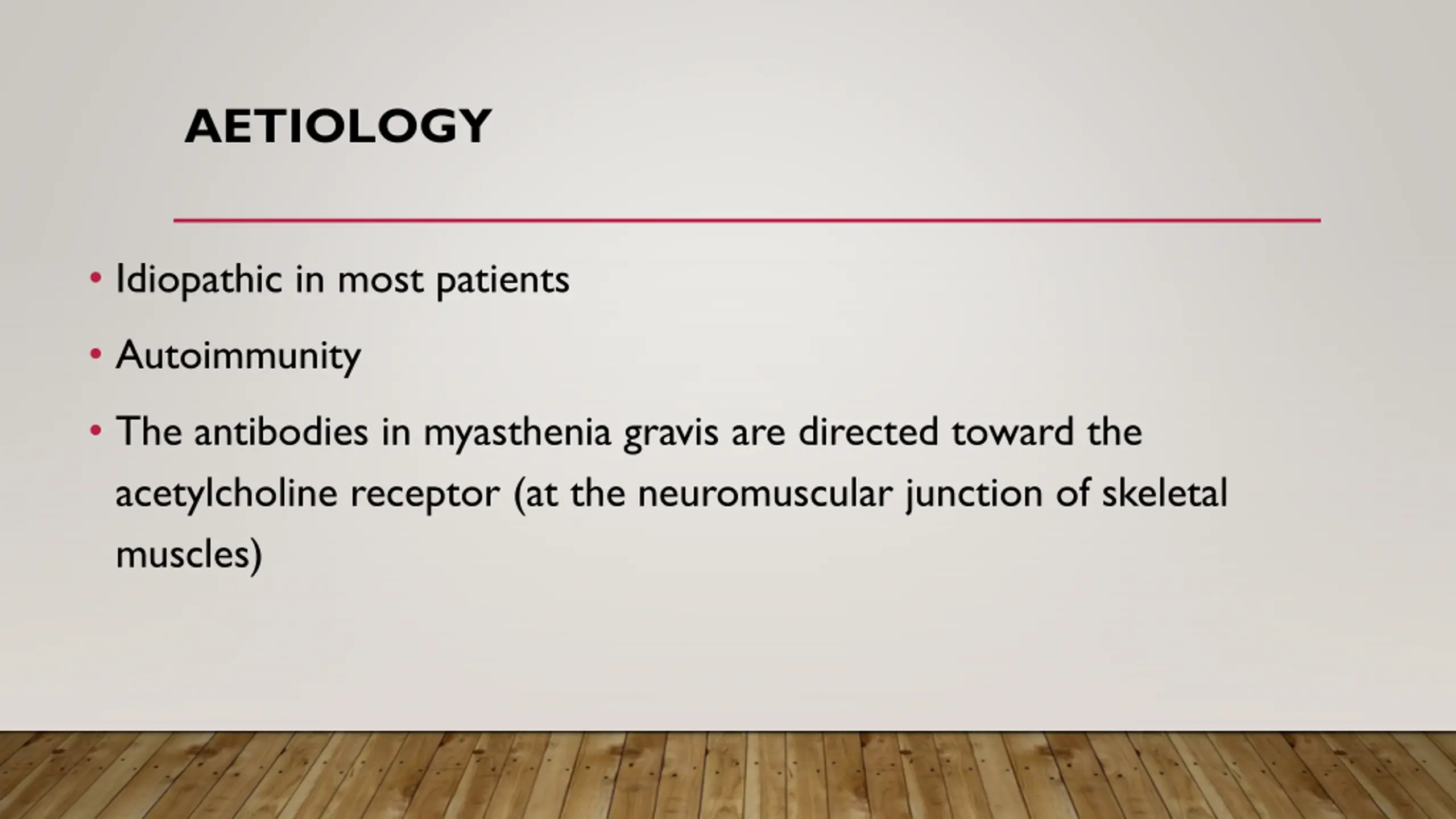 AETIOLOGY Idiopathic in most patients Autoimmunity The antibodies in myasthenia gravis are directed toward the acetylcholine receptor (at the neuromuscular junction of skeletal muscles)