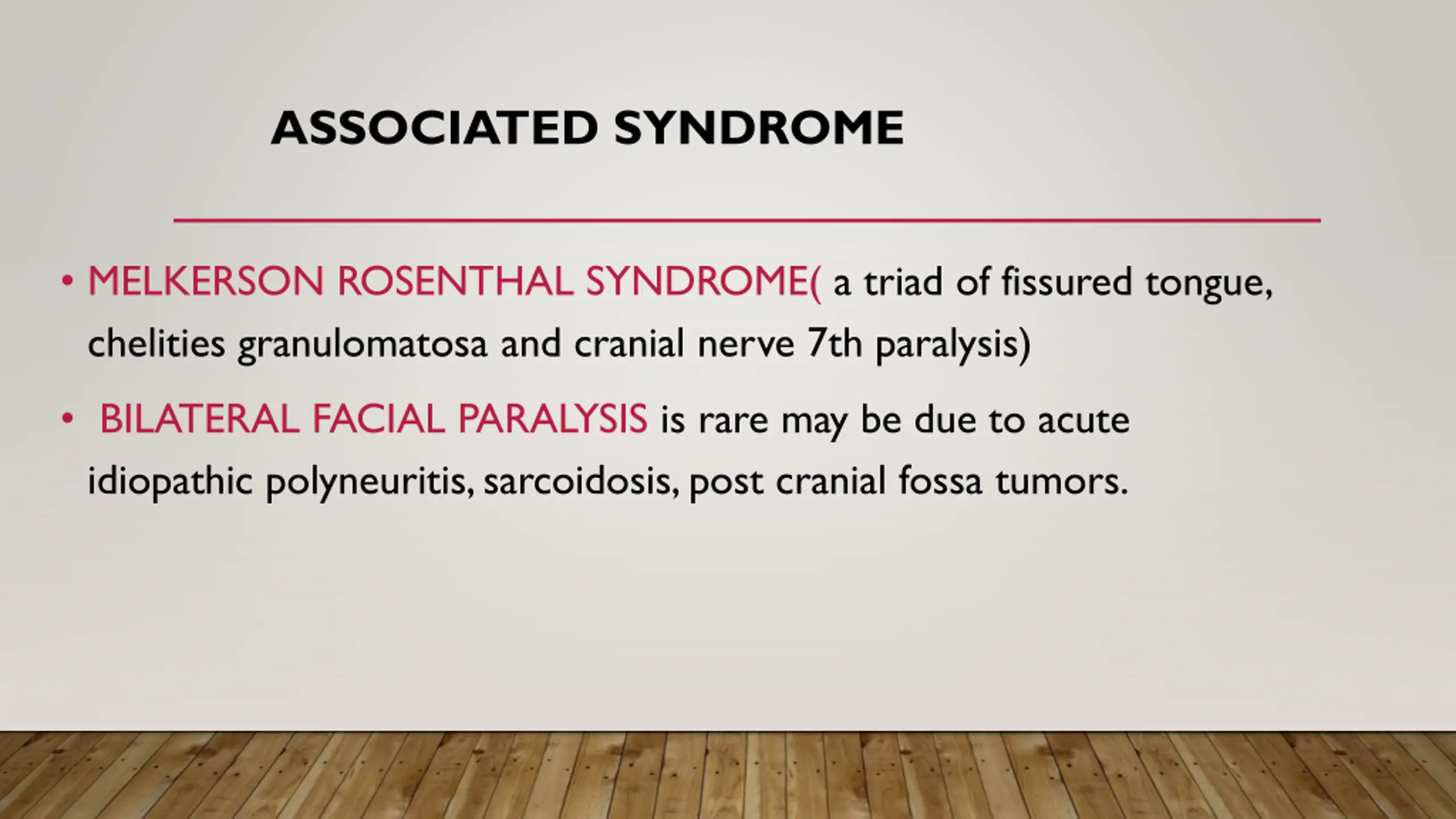 ASSOCIATED SYNDROME MELKERSON ROSENTHAL SYNDROME( a triad of fissured tongue, chelities granulomatosa and cranial nerve 7th paralysis) BILATERAL FACIAL PARALYSIS is rare may be due to acute idiopathic polyneuritis, sarcoidosis, post cranial fossa tumors.