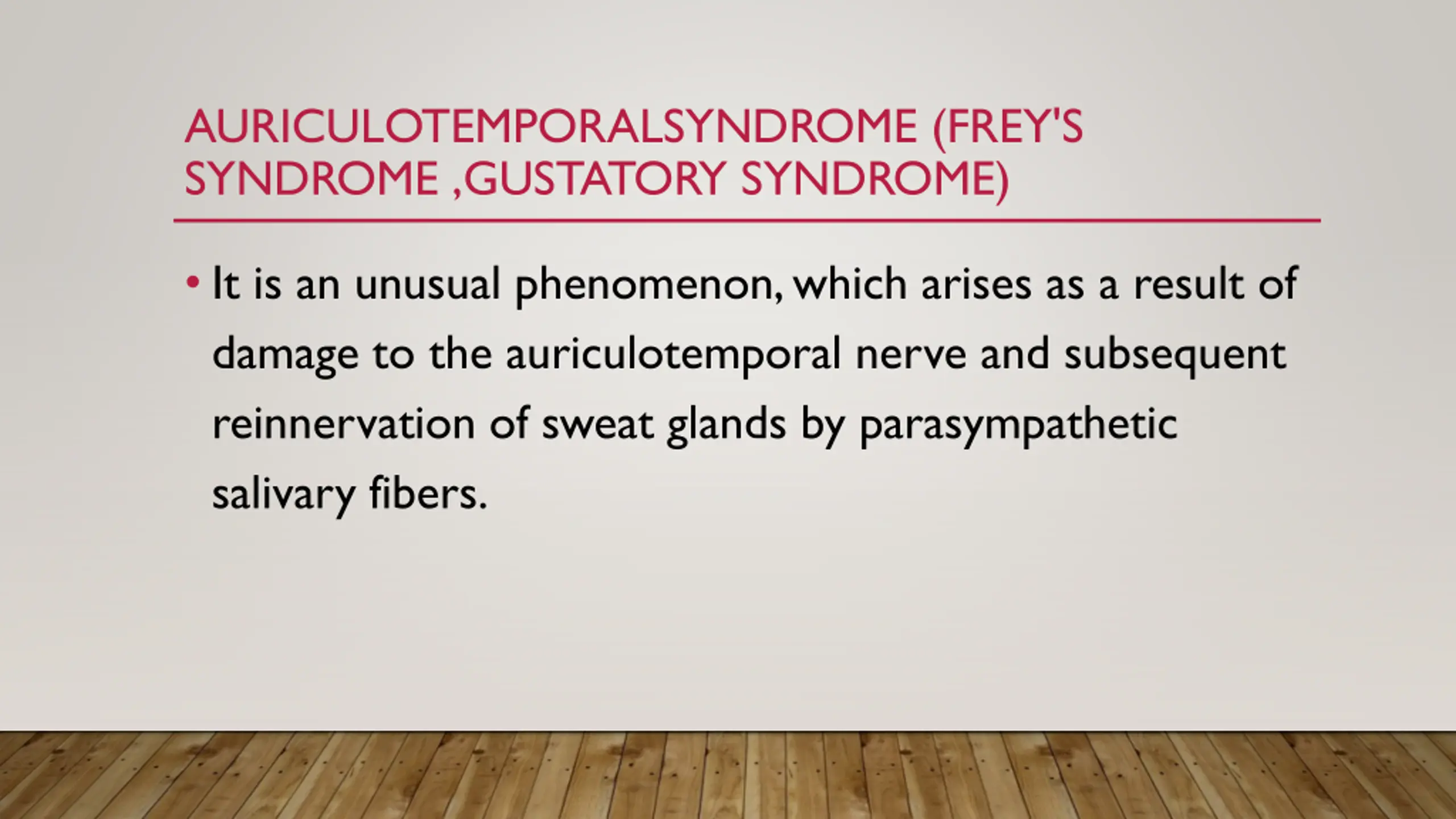 AURICULOTEMPORALSYNDROME (FREY'S SYNDROME ,GUSTATORY SYNDROME) It is an unusual phenomenon, which arises as a result of damage to the auriculotemporal nerve and subsequent reinnervation of sweat glands by parasympathetic salivary fibers.