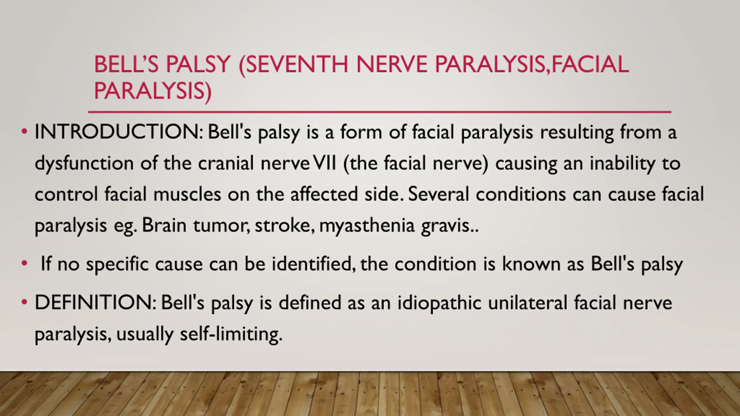 BELLS PALSY (SEVENTH NERVE PARALYSIS,FACIAL PARALYSIS) INTRODUCTION: Bell's palsy is a form of facial paralysis resulting from a dysfunction of the cranial nerve VII (the facial nerve) causing an inability to control facial muscles on the affected side. Several conditions can cause facial paralysis eg. Brain tumor, stroke, myasthenia gravis.. If no specific cause can be identified, the condition is known as Bell's palsy DEFINITION: Bell's palsy is defined as an idiopathic unilateral facial nerve paralysis, usually self-limiting.