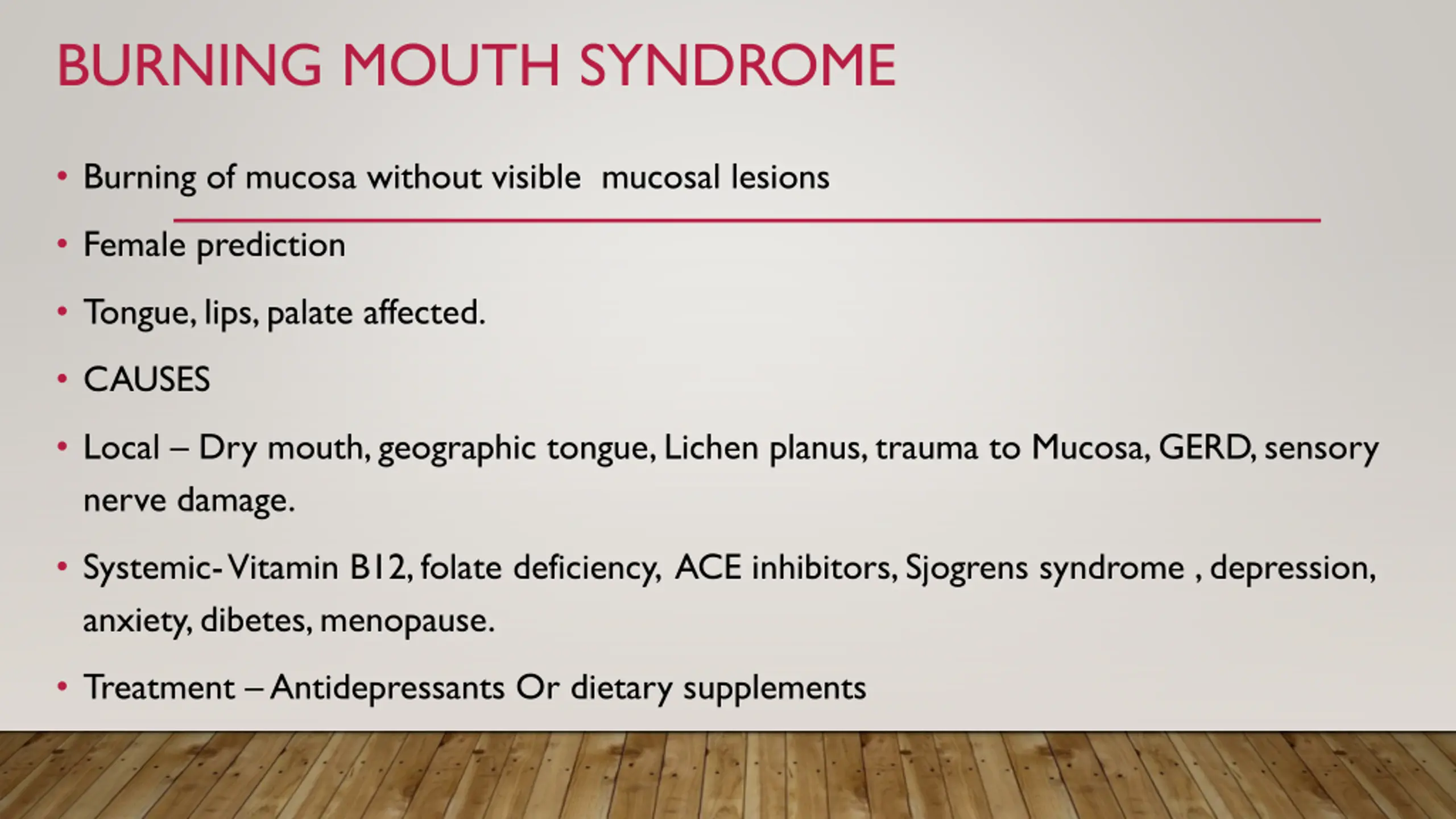 BURNING MOUTH SYNDROME Burning of mucosa without visible mucosal lesions Female prediction Tongue, lips, palate affected. CAUSES Local Dry mouth, geographic tongue, Lichen planus, trauma to Mucosa, GERD, sensory nerve damage. Systemic- Vitamin B12, folate deficiency, ACE inhibitors, Sjogrens syndrome , depression, anxiety, dibetes, menopause. Treatment Antidepressants Or dietary supplements
