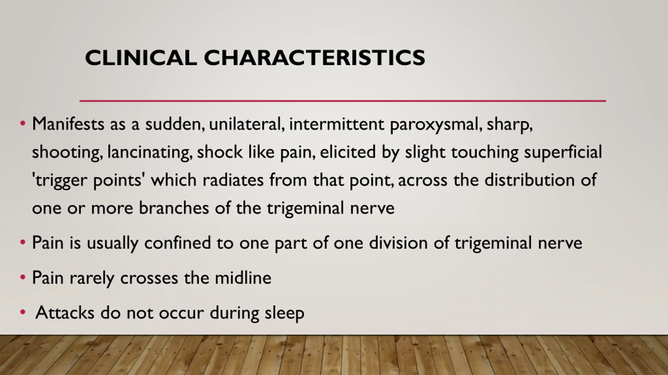 CLINICAL CHARACTERISTICS Manifests as a sudden, unilateral, intermittent paroxysmal, sharp, shooting, lancinating, shock like pain, elicited by slight touching superficial 'trigger points' which radiates from that point, across the distribution of one or more branches of the trigeminal nerve Pain is usually confined to one part of one division of trigeminal nerve Pain rarely crosses the midline Attacks do not occur during sleep