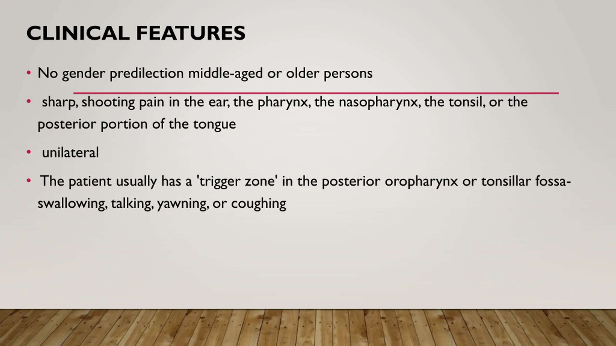 CLINICAL FEATURES No gender predilection middle-aged or older persons sharp, shooting pain in the ear, the pharynx, the nasopharynx, the tonsil, or the posterior portion of the tongue unilateral The patient usually has a 'trigger zone' in the posterior oropharynx or tonsillar fossa- swallowing, talking, yawning, or coughing