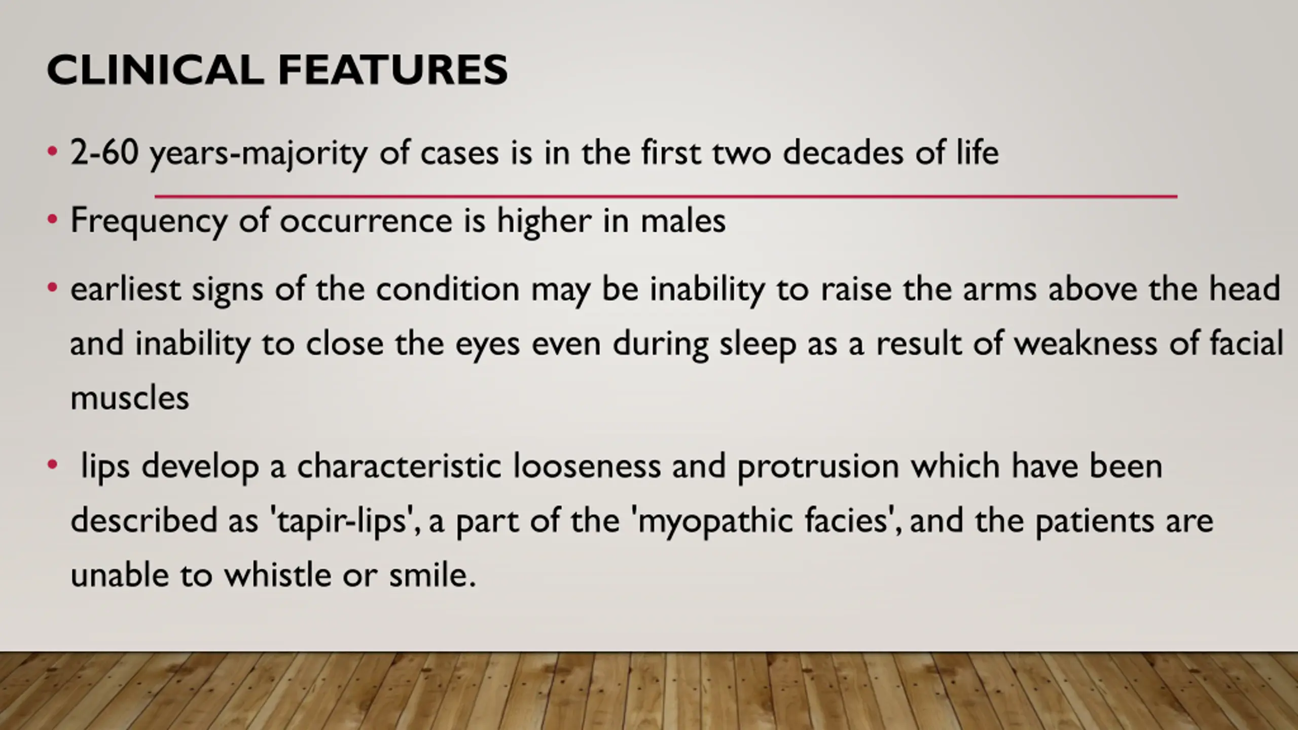 CLINICAL FEATURES 2-60 years-majority of cases is in the first two decades of life Frequency of occurrence is higher in males earliest signs of the condition may be inability to raise the arms above the head and inability to close the eyes even during sleep as a result of weakness of facial muscles lips develop a characteristic looseness and protrusion which have been described as 'tapir-lips', a part of the 'myopathic facies', and the patients are unable to whistle or smile.