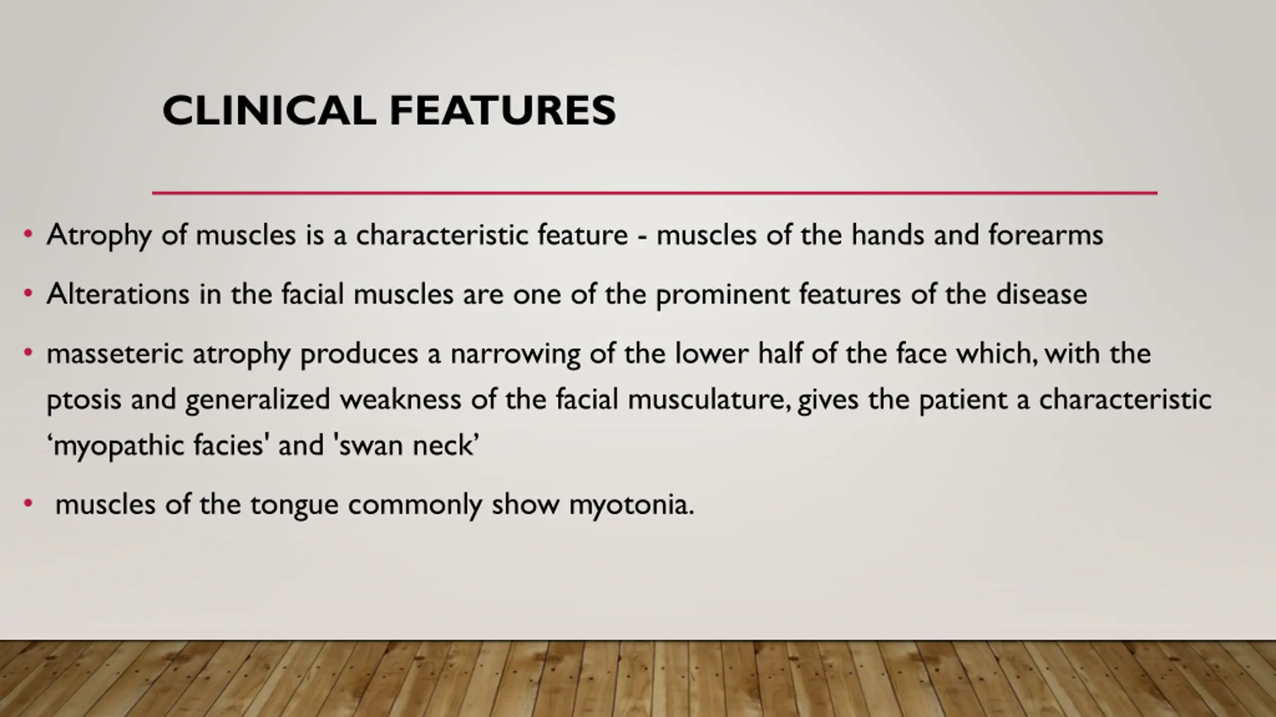 CLINICAL FEATURES Atrophy of muscles is a characteristic feature - muscles of the hands and forearms Alterations in the facial muscles are one of the prominent features of the disease masseteric atrophy produces a narrowing of the lower half of the face which, with the ptosis and generalized weakness of the facial musculature, gives the patient a characteristic myopathic facies' and 'swan neck muscles of the tongue commonly show myotonia.