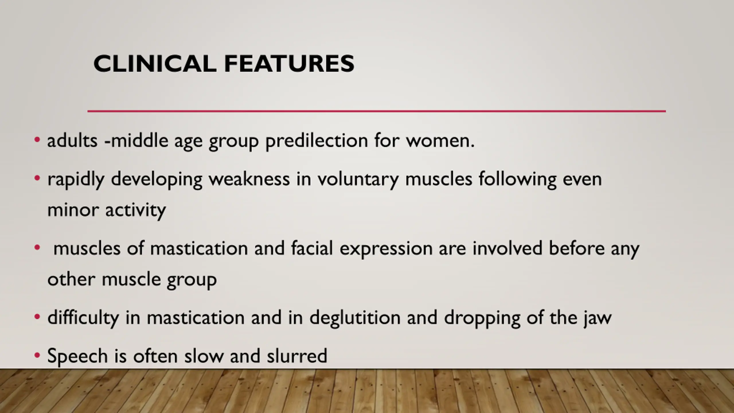 CLINICAL FEATURES adults -middle age group predilection for women. rapidly developing weakness in voluntary muscles following even minor activity muscles of mastication and facial expression are involved before any other muscle group difficulty in mastication and in deglutition and dropping of the jaw Speech is often slow and slurred