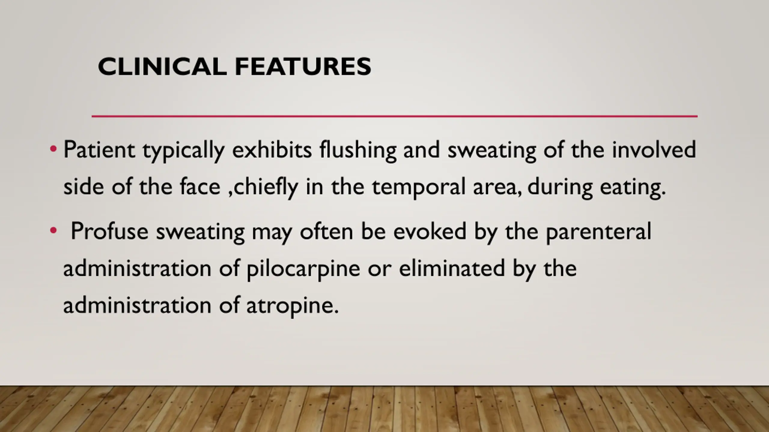CLINICAL FEATURES Patient typically exhibits flushing and sweating of the involved side of the face ,chiefly in the temporal area, during eating. Profuse sweating may often be evoked by the parenteral administration of pilocarpine or eliminated by the administration of atropine.