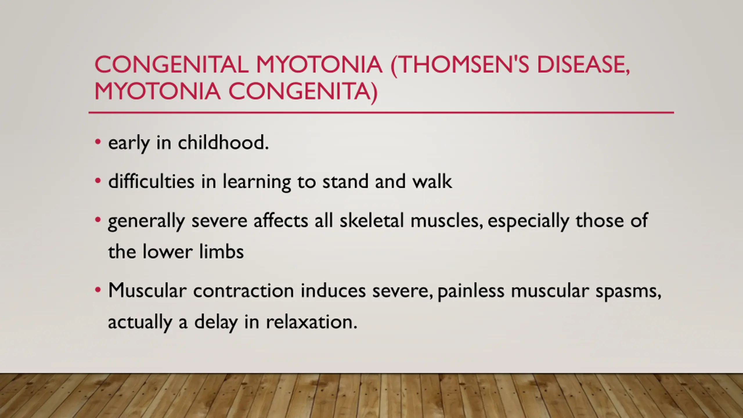 CONGENITAL MYOTONIA (THOMSEN'S DISEASE, MYOTONIA CONGENITA) early in childhood. difficulties in learning to stand and walk generally severe affects all skeletal muscles, especially those of the lower limbs Muscular contraction induces severe, painless muscular spasms, actually a delay in relaxation.