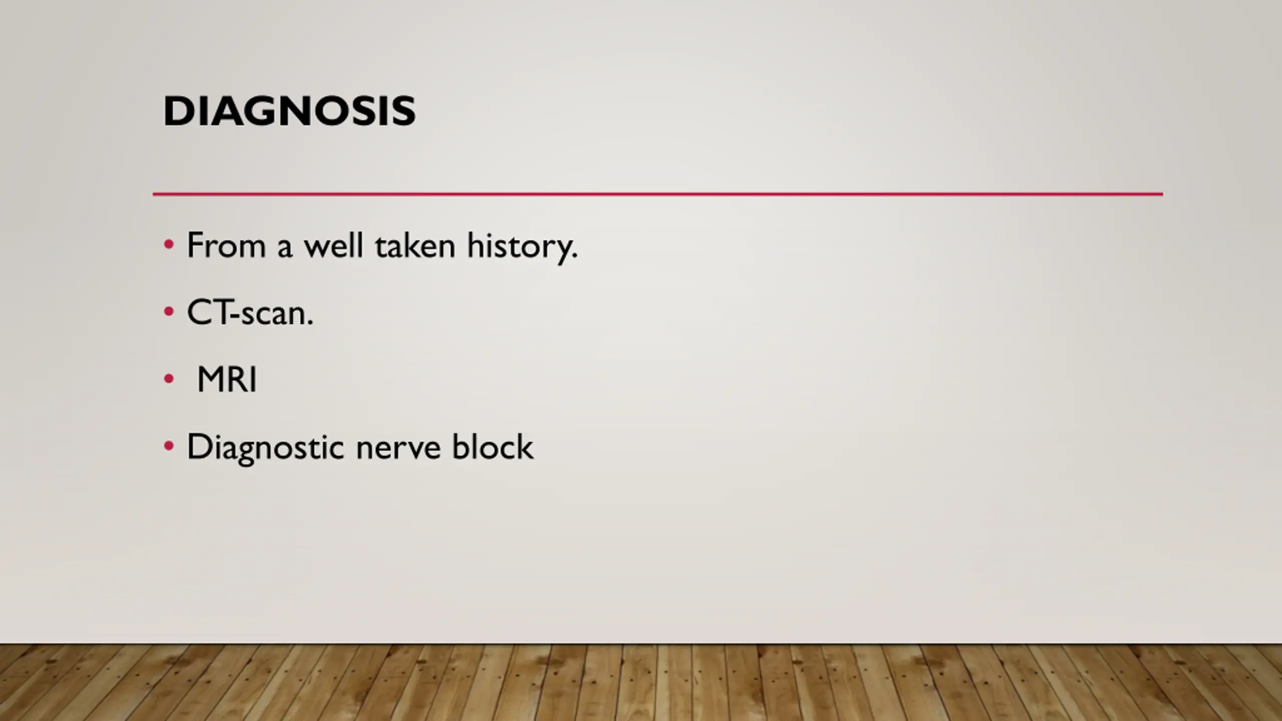 DIAGNOSIS From a well taken history. CT-scan. MRI Diagnostic nerve block