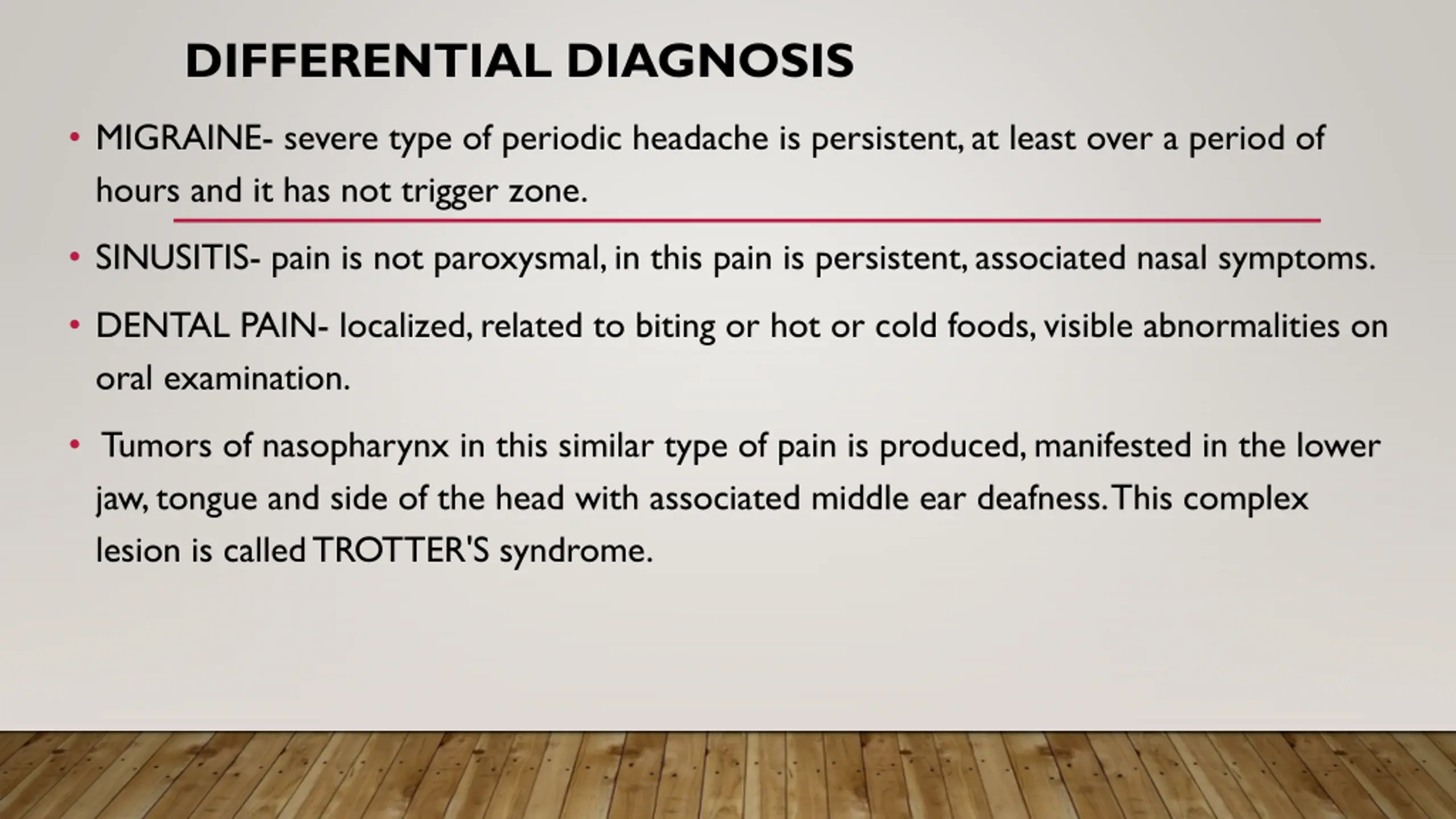 DIFFERENTIAL DIAGNOSIS MIGRAINE- severe type of periodic headache is persistent, at least over a period of hours and it has not trigger zone. SINUSITIS- pain is not paroxysmal, in this pain is persistent, associated nasal symptoms. DENTAL PAIN- localized, related to biting or hot or cold foods, visible abnormalities on oral examination. Tumors of nasopharynx in this similar type of pain is produced, manifested in the lower jaw, tongue and side of the head with associated middle ear deafness. This complex lesion is called TROTTER'S syndrome.