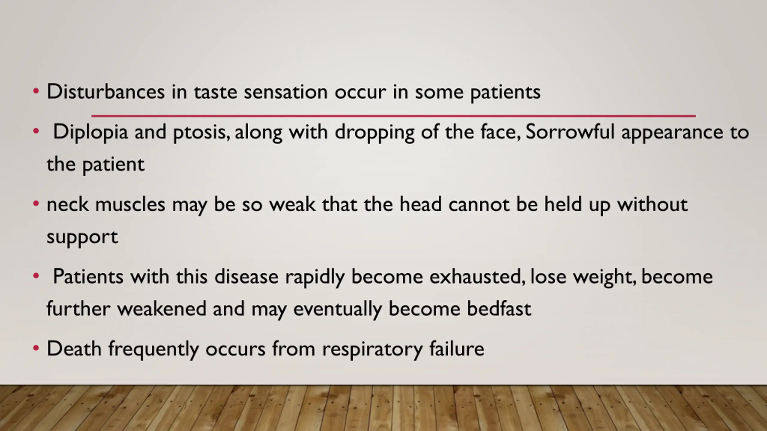 Disturbances in taste sensation occur in some patients Diplopia and ptosis, along with dropping of the face, Sorrowful appearance to the patient neck muscles may be so weak that the head cannot be held up without support Patients with this disease rapidly become exhausted, lose weight, become further weakened and may eventually become bedfast Death frequently occurs from respiratory failure