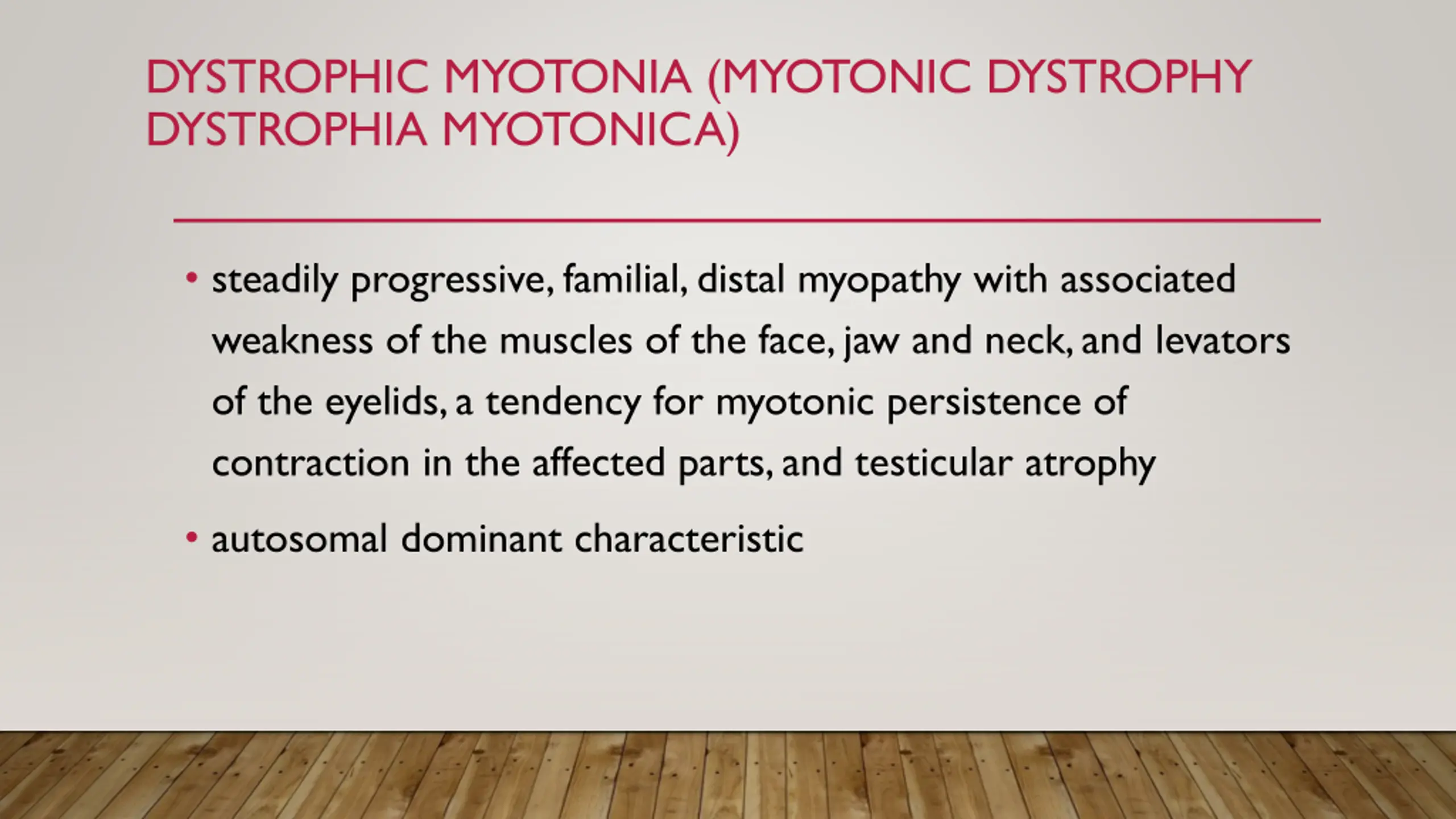 DYSTROPHIC MYOTONIA (MYOTONIC DYSTROPHY DYSTROPHIA MYOTONICA) steadily progressive, familial, distal myopathy with associated weakness of the muscles of the face, jaw and neck, and levators of the eyelids, a tendency for myotonic persistence of contraction in the affected parts, and testicular atrophy autosomal dominant characteristic