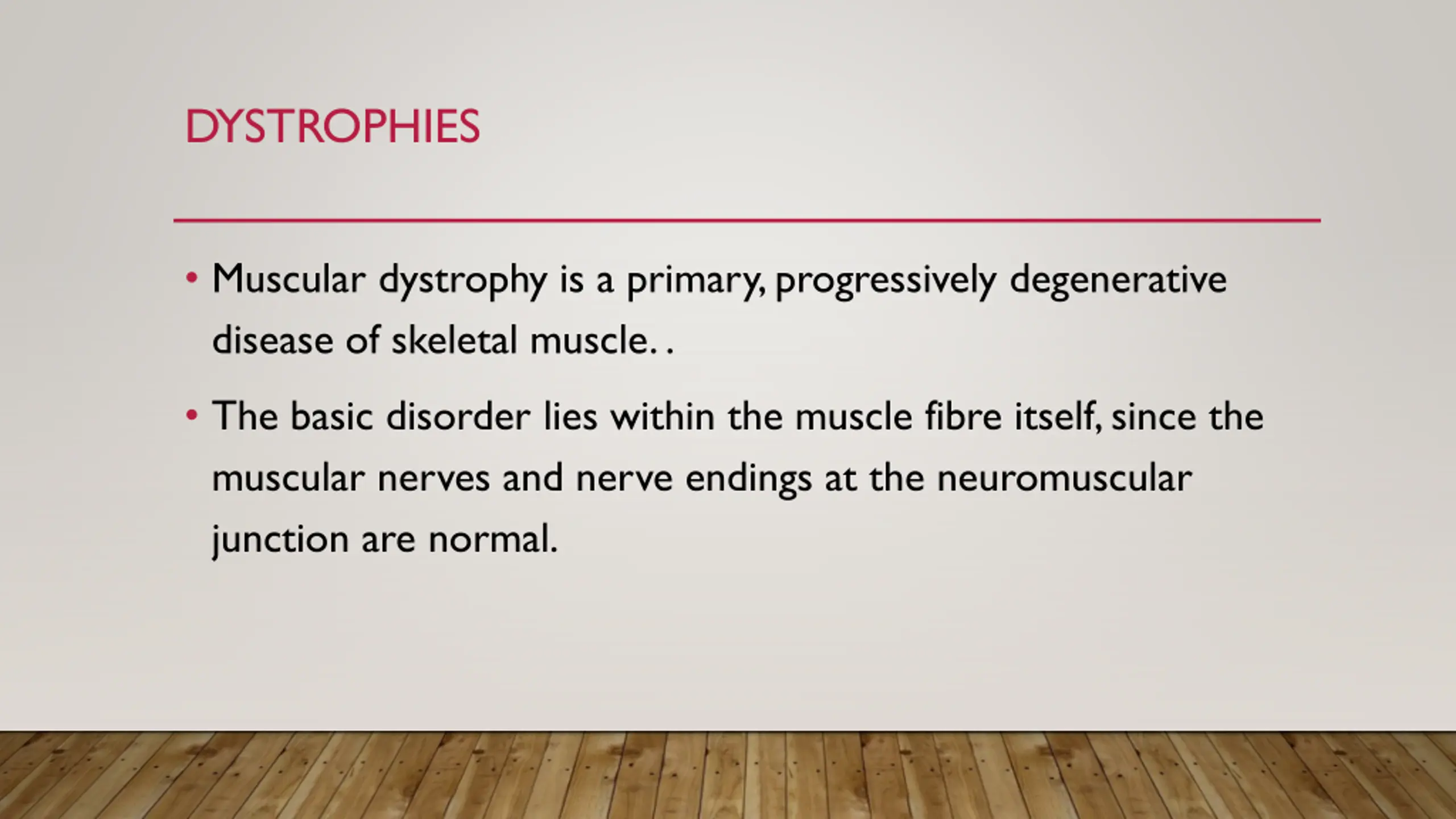 DYSTROPHIES Muscular dystrophy is a primary, progressively degenerative disease of skeletal muscle. . The basic disorder lies within the muscle fibre itself, since the muscular nerves and nerve endings at the neuromuscular junction are normal.