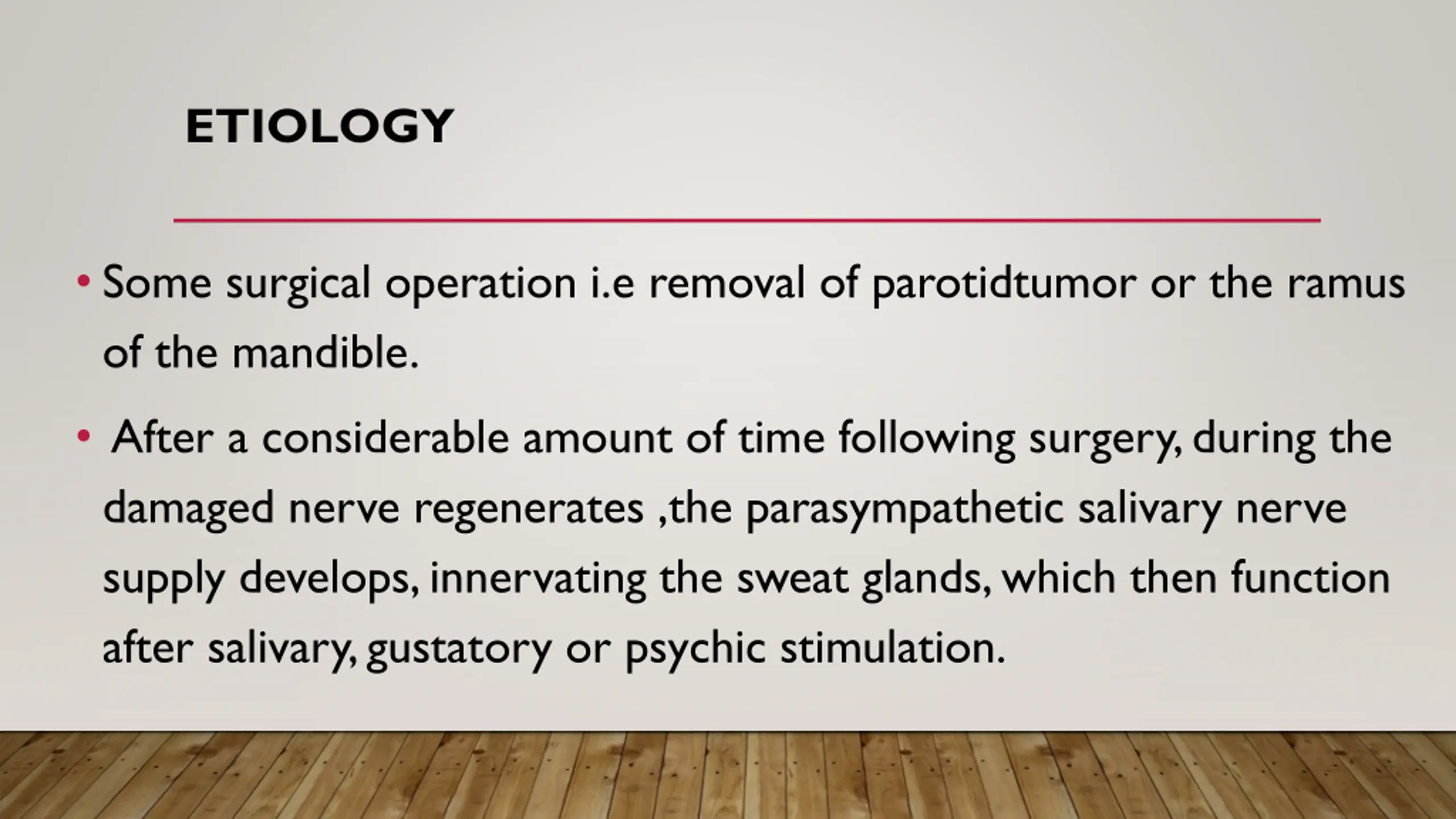 ETIOLOGY Some surgical operation i.e removal of parotidtumor or the ramus of the mandible. After a considerable amount of time following surgery, during the damaged nerve regenerates ,the parasympathetic salivary nerve supply develops, innervating the sweat glands, which then function after salivary, gustatory or psychic stimulation.