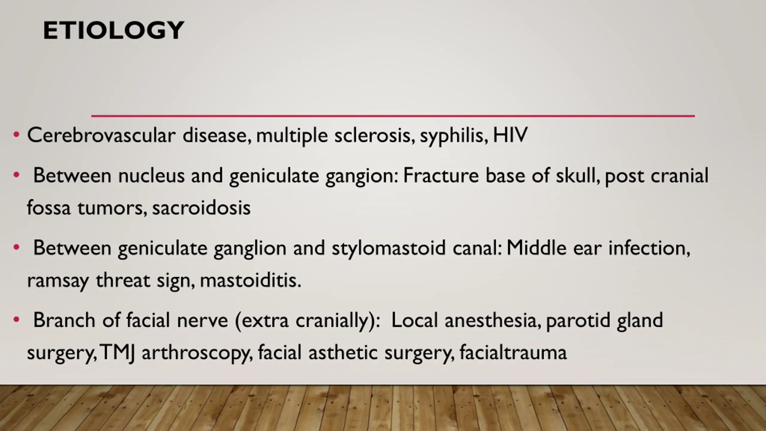 ETIOLOGY Cerebrovascular disease, multiple sclerosis, syphilis, HIV Between nucleus and geniculate gangion: Fracture base of skull, post cranial fossa tumors, sacroidosis Between geniculate ganglion and stylomastoid canal: Middle ear infection, ramsay threat sign, mastoiditis. Branch of facial nerve (extra cranially): Local anesthesia, parotid gland surgery, TMJ arthroscopy, facial asthetic surgery, facialtrauma