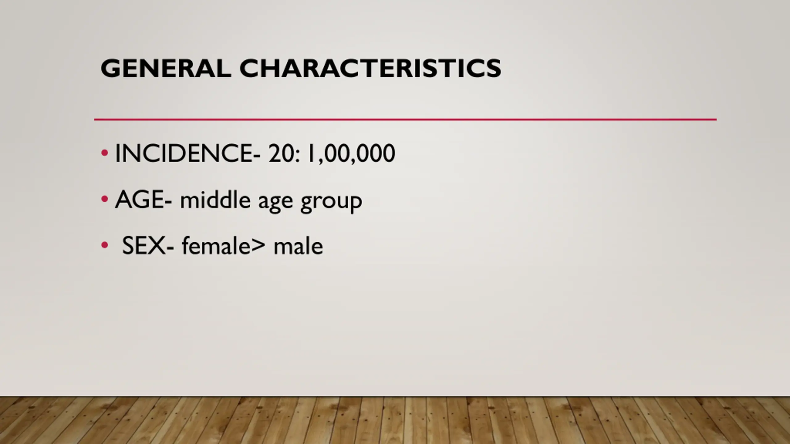 GENERAL CHARACTERISTICS INCIDENCE- 20: 1,00,000 AGE- middle age group SEX- female> male