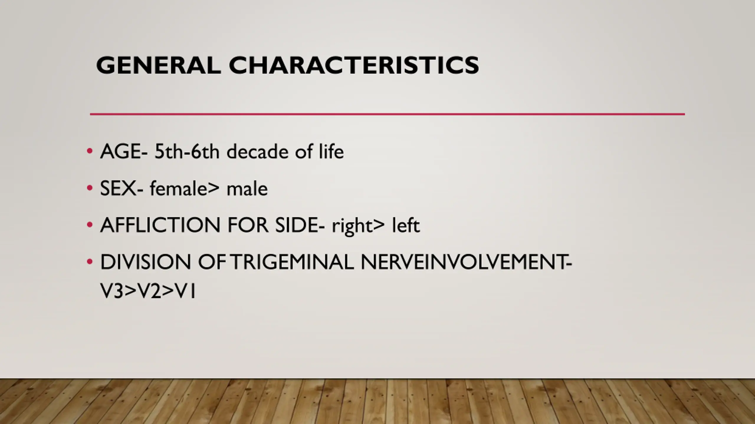 GENERAL CHARACTERISTICS AGE- 5th-6th decade of life SEX- female> male AFFLICTION FOR SIDE- right> left DIVISION OF TRIGEMINAL NERVEINVOLVEMENT- V3>V2>V1
