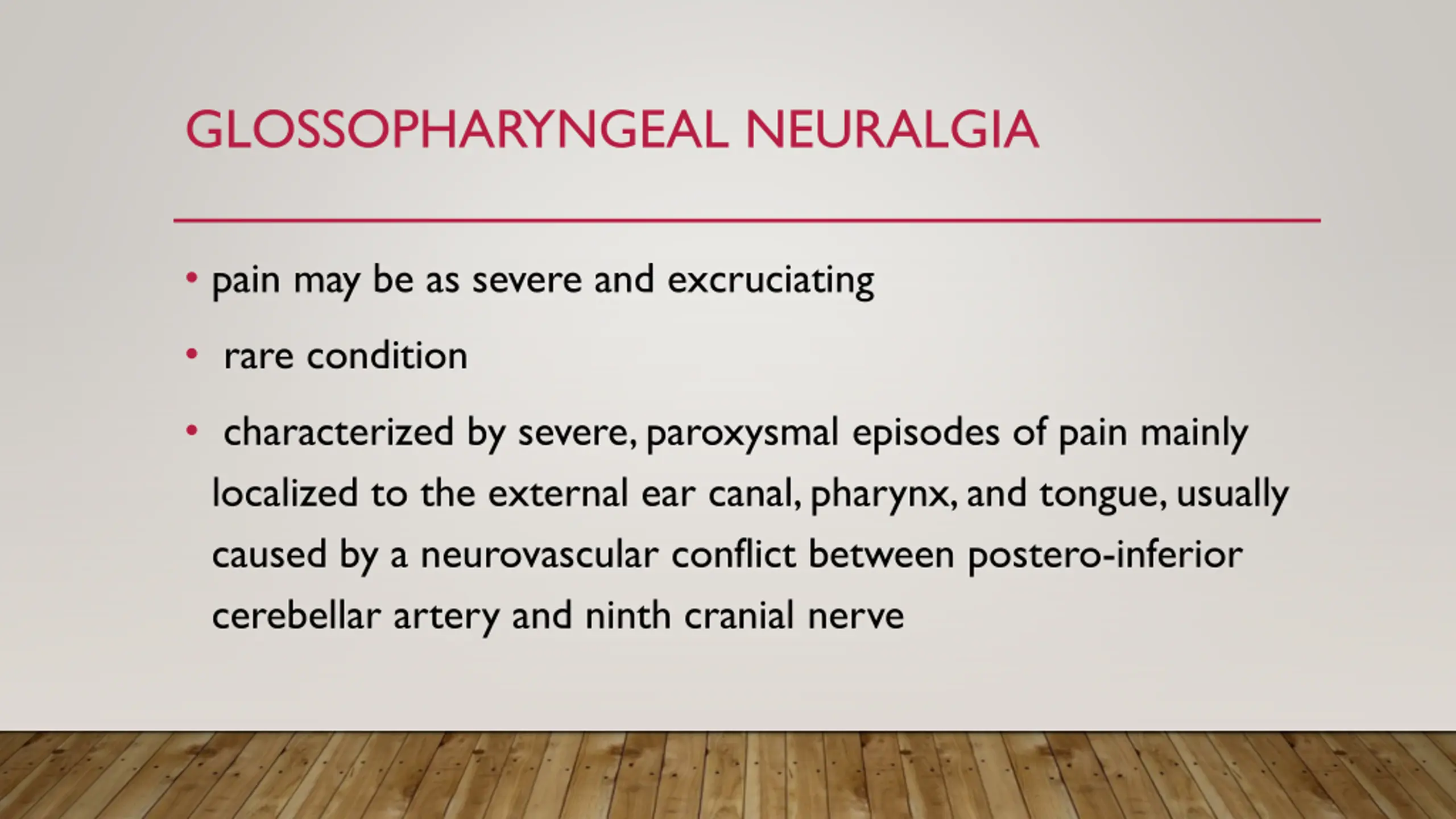 GLOSSOPHARYNGEAL NEURALGIA pain may be as severe and excruciating rare condition characterized by severe, paroxysmal episodes of pain mainly localized to the external ear canal, pharynx, and tongue, usually caused by a neurovascular conflict between postero-inferior cerebellar artery and ninth cranial nerve