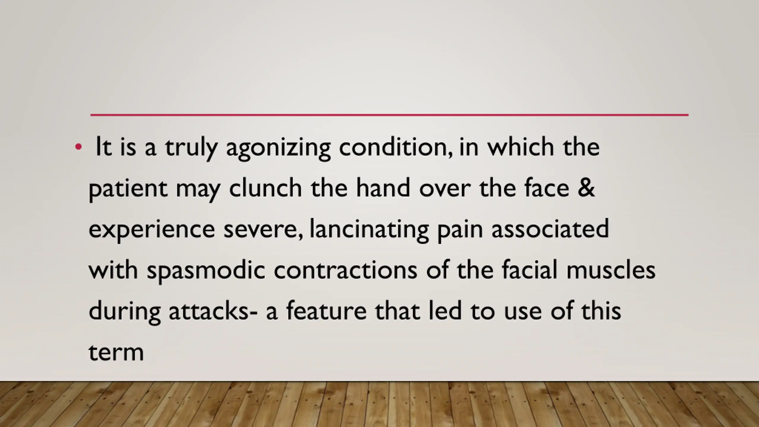 It is a truly agonizing condition, in which the patient may clunch the hand over the face & experience severe, lancinating pain associated with spasmodic contractions of the facial muscles during attacks- a feature that led to use of this term