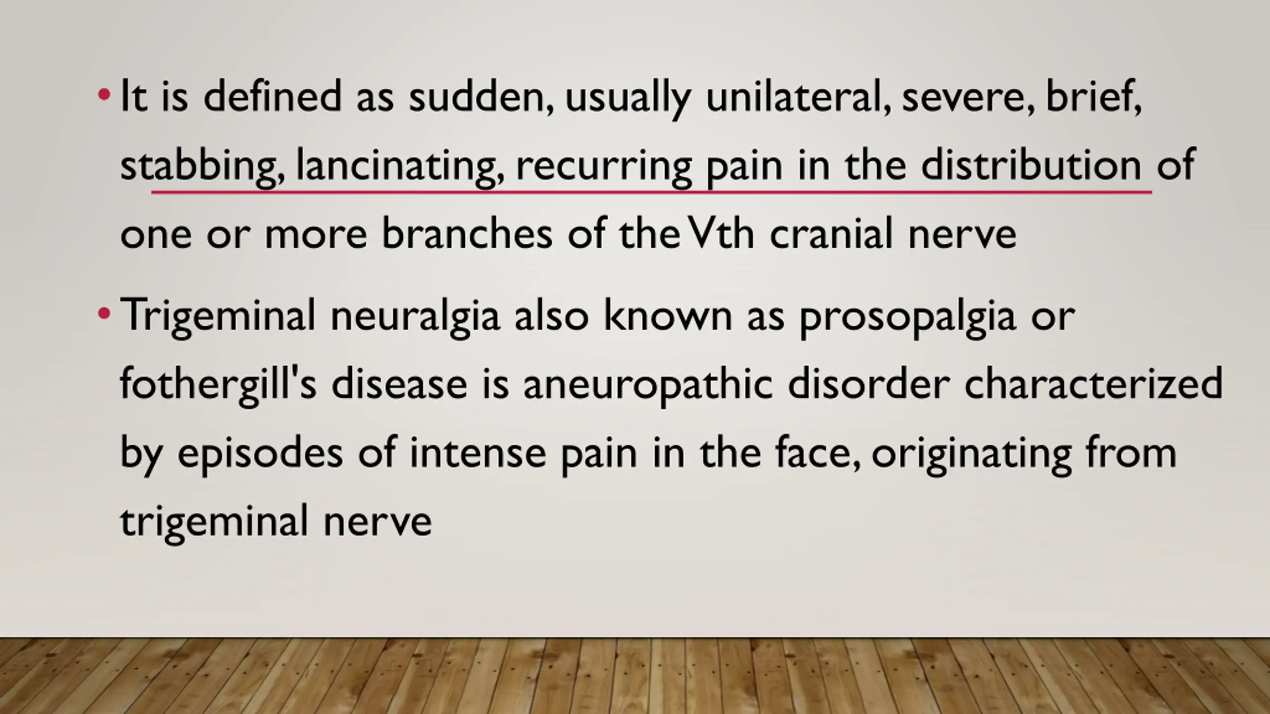 It is defined as sudden, usually unilateral, severe, brief, stabbing, lancinating, recurring pain in the distribution of one or more branches of the Vth cranial nerve Trigeminal neuralgia also known as prosopalgia or fothergill's disease is aneuropathic disorder characterized by episodes of intense pain in the face, originating from trigeminal nerve