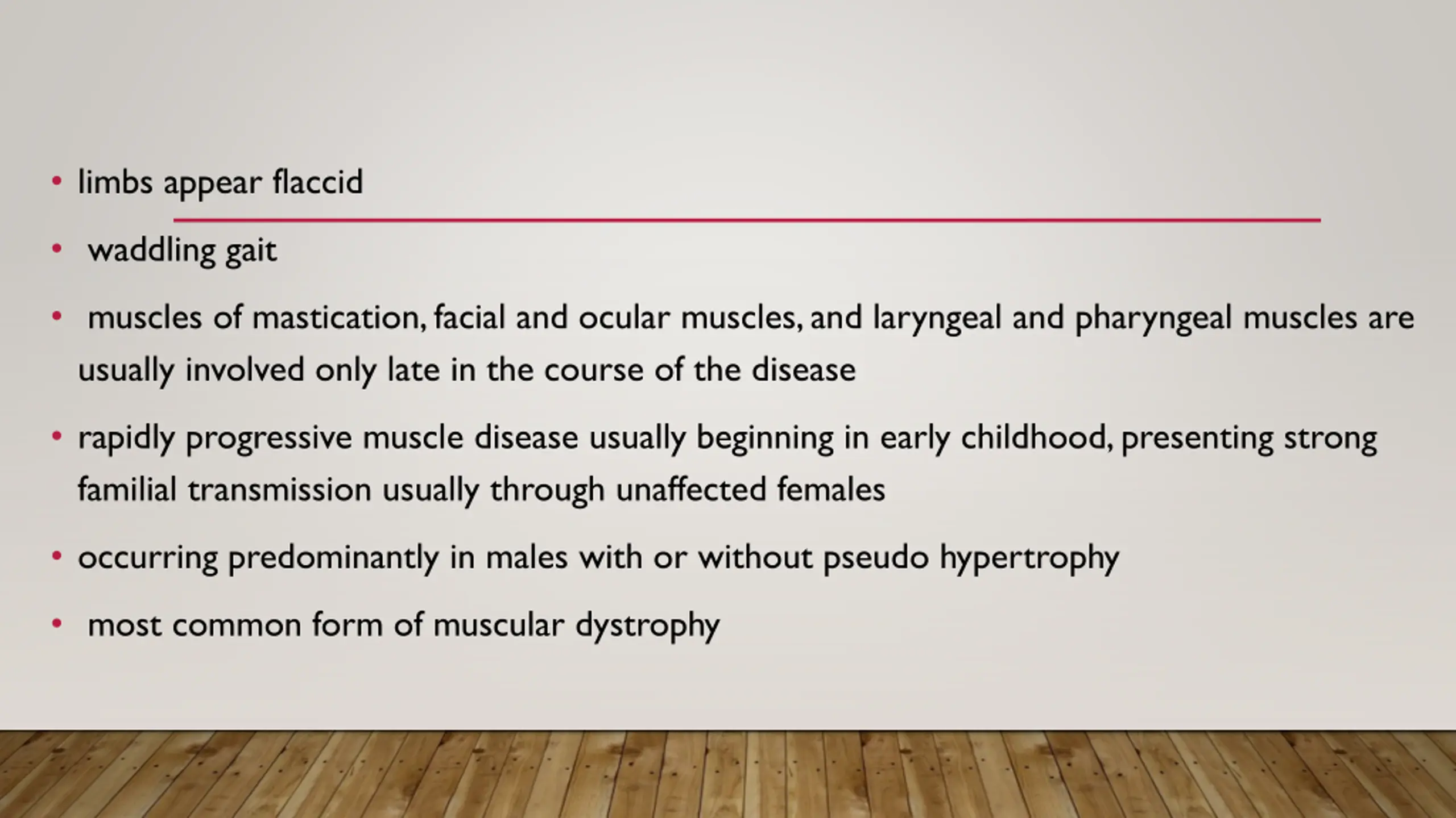 limbs appear flaccid waddling gait muscles of mastication, facial and ocular muscles, and laryngeal and pharyngeal muscles are usually involved only late in the course of the disease rapidly progressive muscle disease usually beginning in early childhood, presenting strong familial transmission usually through unaffected females occurring predominantly in males with or without pseudo hypertrophy most common form of muscular dystrophy