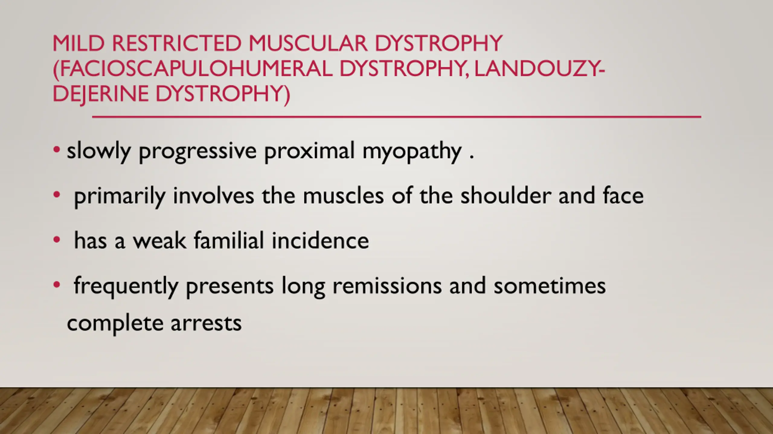 MILD RESTRICTED MUSCULAR DYSTROPHY (FACIOSCAPULOHUMERAL DYSTROPHY, LANDOUZY- DEJERINE DYSTROPHY) slowly progressive proximal myopathy . primarily involves the muscles of the shoulder and face has a weak familial incidence frequently presents long remissions and sometimes complete arrests