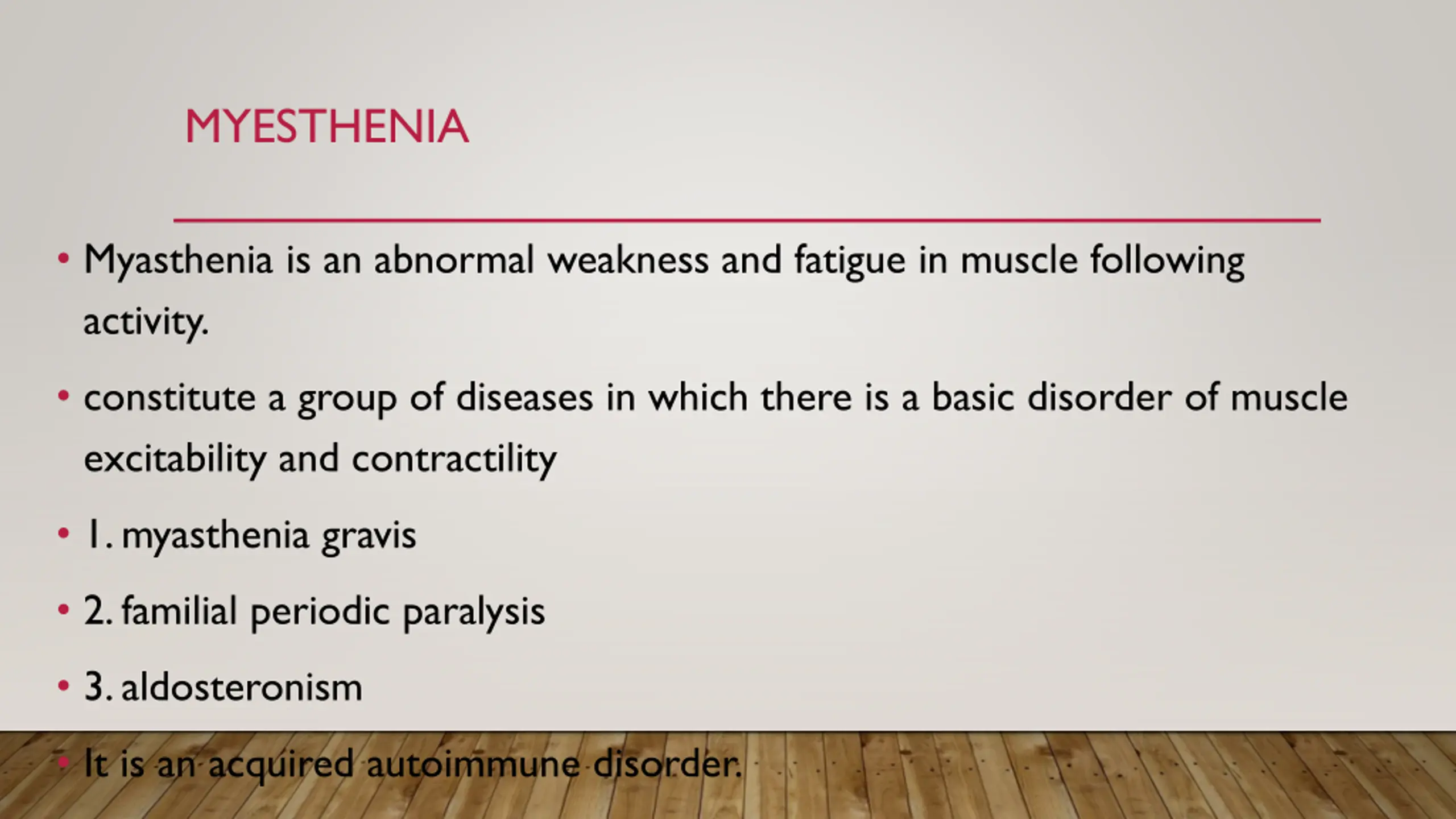 MYESTHENIA Myasthenia is an abnormal weakness and fatigue in muscle following activity. constitute a group of diseases in which there is a basic disorder of muscle excitability and contractility 1. myasthenia gravis 2. familial periodic paralysis 3. aldosteronism It is an acquired autoimmune disorder.