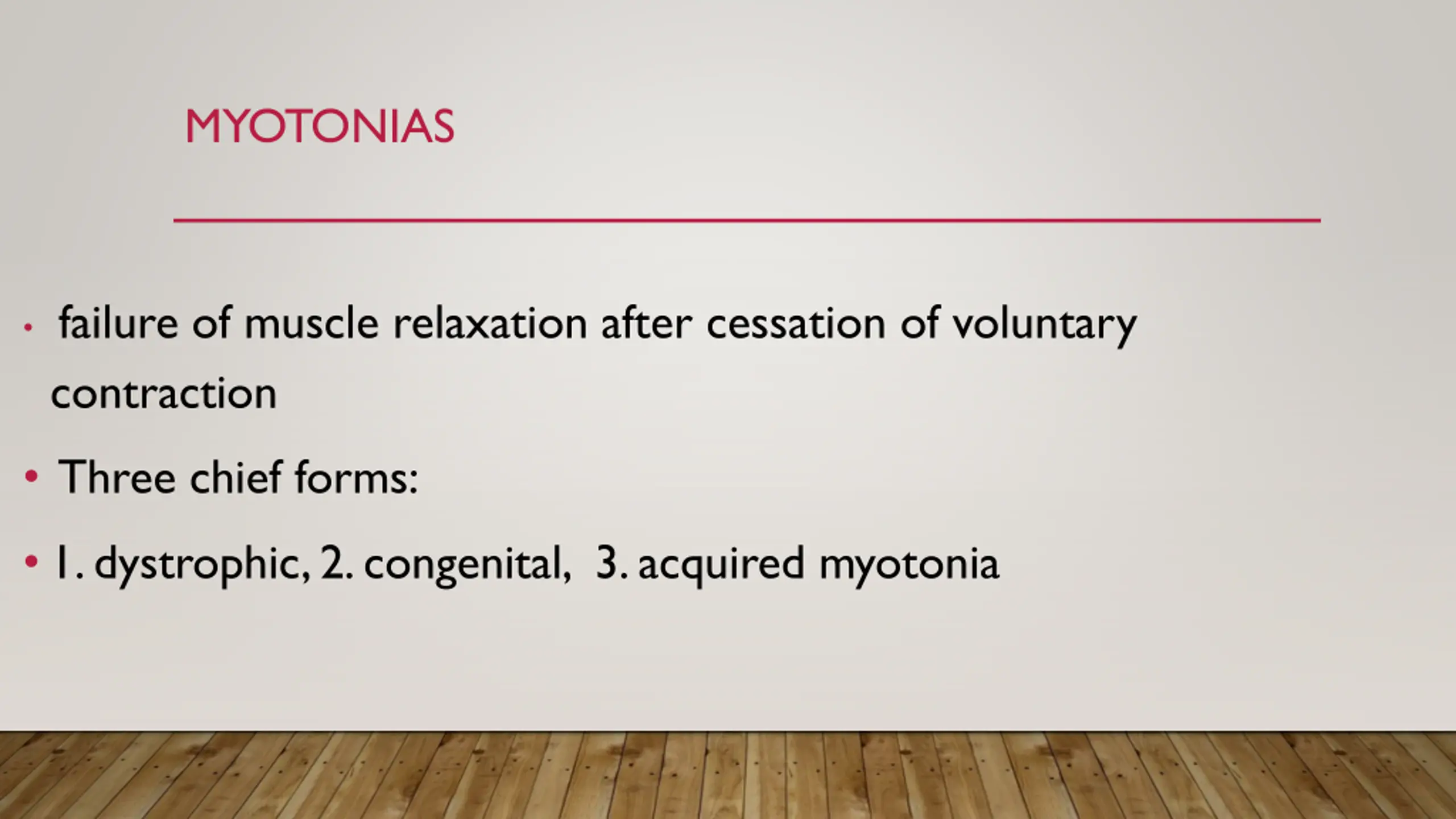 MYOTONIAS failure of muscle relaxation after cessation of voluntary contraction Three chief forms: 1. dystrophic, 2. congenital, 3. acquired myotonia