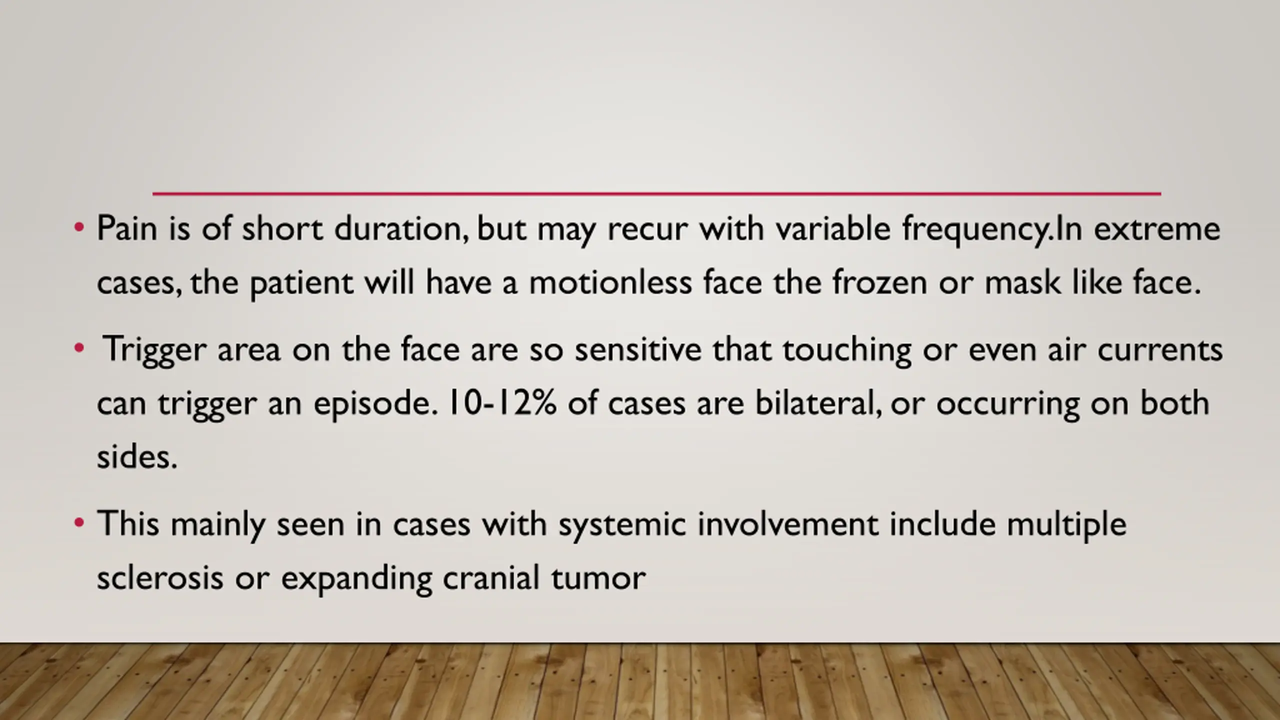 Pain is of short duration, but may recur with variable frequency.In extreme cases, the patient will have a motionless face the frozen or mask like face. Trigger area on the face are so sensitive that touching or even air currents can trigger an episode. 10-12% of cases are bilateral, or occurring on both sides. This mainly seen in cases with systemic involvement include multiple sclerosis or expanding cranial tumor