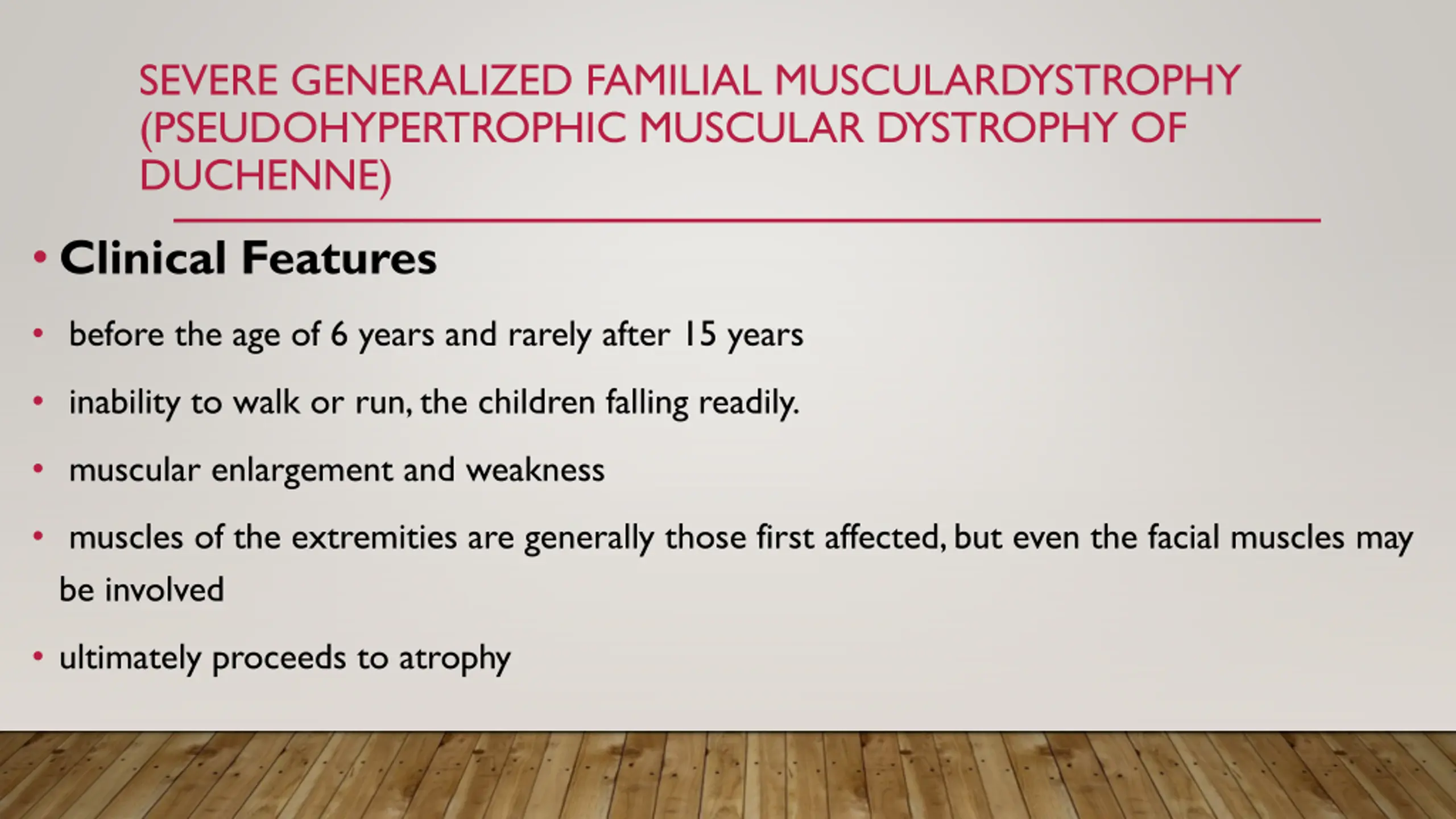 SEVERE GENERALIZED FAMILIAL MUSCULARDYSTROPHY (PSEUDOHYPERTROPHIC MUSCULAR DYSTROPHY OF DUCHENNE) Clinical Features before the age of 6 years and rarely after 15 years inability to walk or run, the children falling readily. muscular enlargement and weakness muscles of the extremities are generally those first affected, but even the facial muscles may be involved ultimately proceeds to atrophy