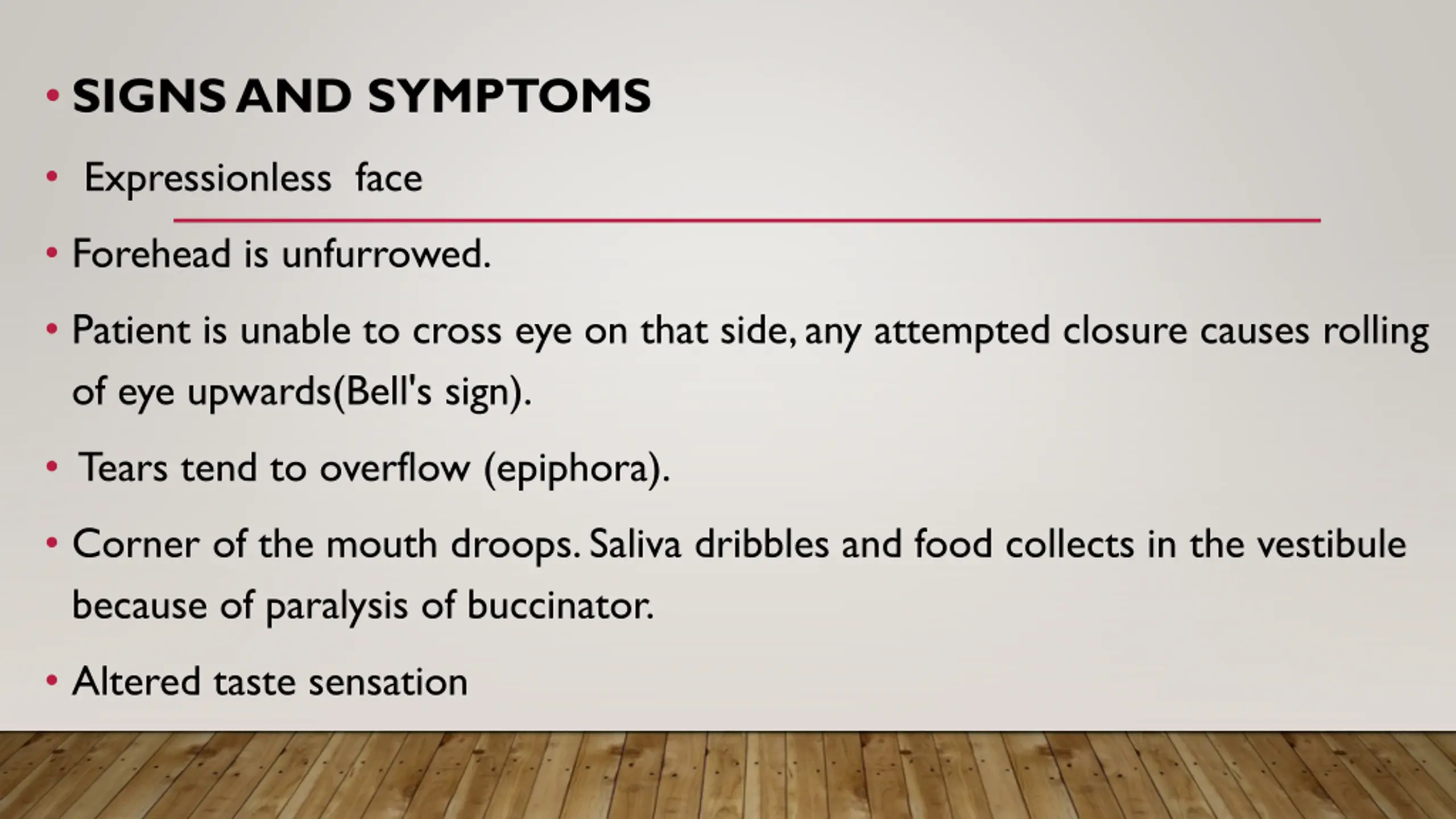 SIGNS AND SYMPTOMS Expressionless face Forehead is unfurrowed. Patient is unable to cross eye on that side, any attempted closure causes rolling of eye upwards(Bell's sign). Tears tend to overflow (epiphora). Corner of the mouth droops. Saliva dribbles and food collects in the vestibule because of paralysis of buccinator. Altered taste sensation