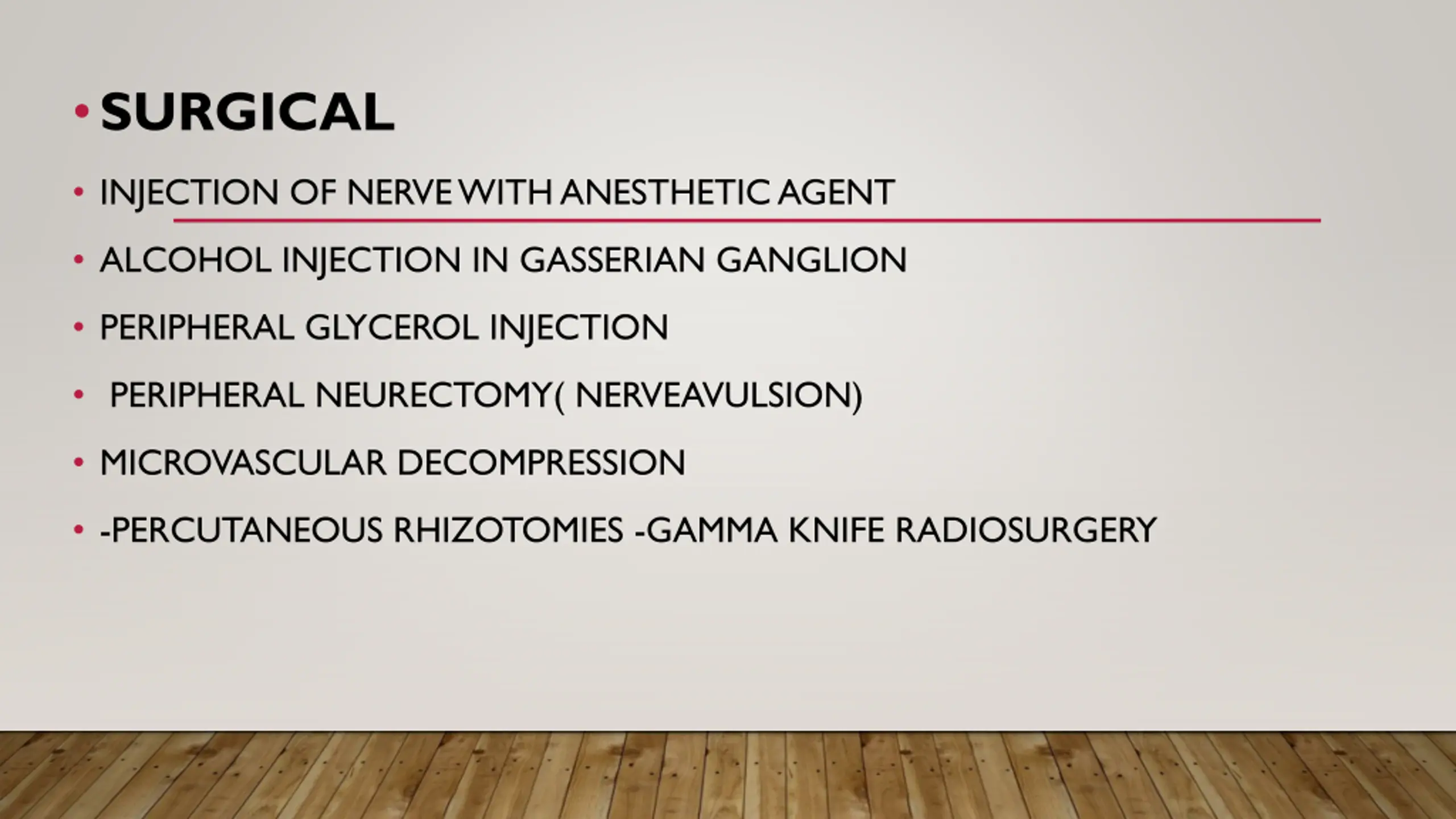 SURGICAL INJECTION OF NERVE WITH ANESTHETIC AGENT ALCOHOL INJECTION IN GASSERIAN GANGLION PERIPHERAL GLYCEROL INJECTION PERIPHERAL NEURECTOMY( NERVEAVULSION) MICROVASCULAR DECOMPRESSION -PERCUTANEOUS RHIZOTOMIES -GAMMA KNIFE RADIOSURGERY