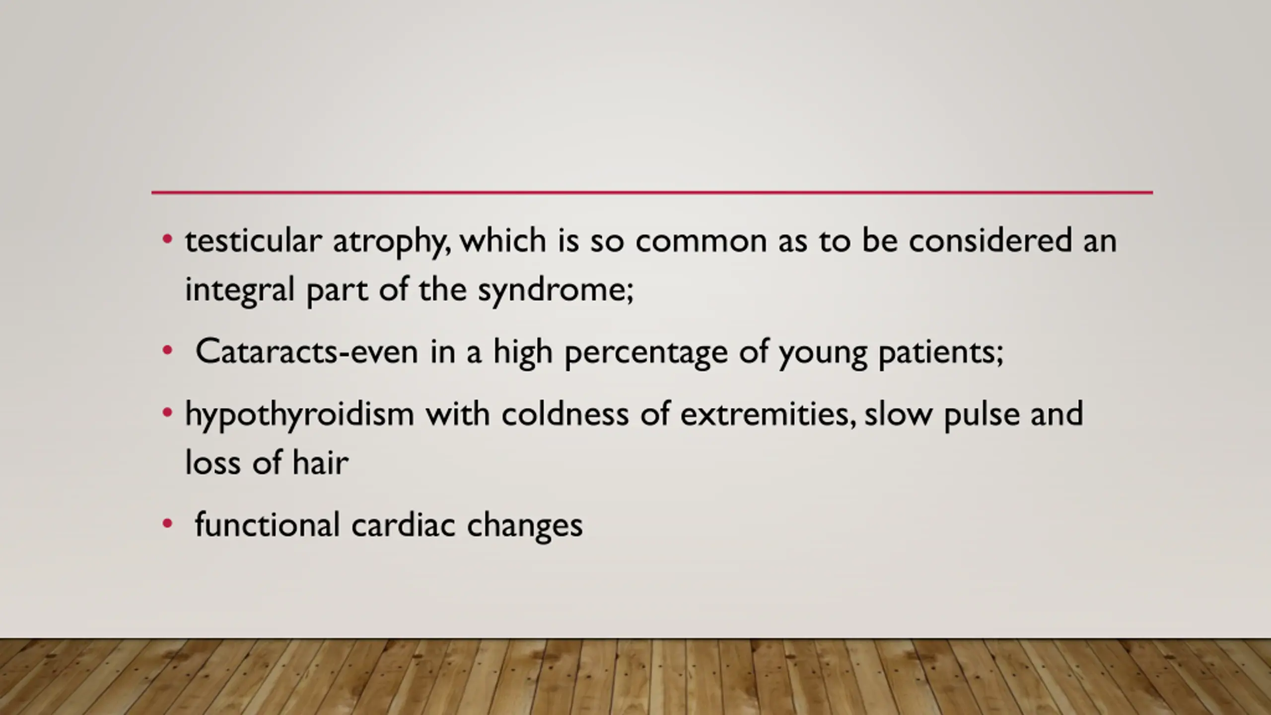 testicular atrophy, which is so common as to be considered an integral part of the syndrome; Cataracts-even in a high percentage of young patients; hypothyroidism with coldness of extremities, slow pulse and loss of hair functional cardiac changes