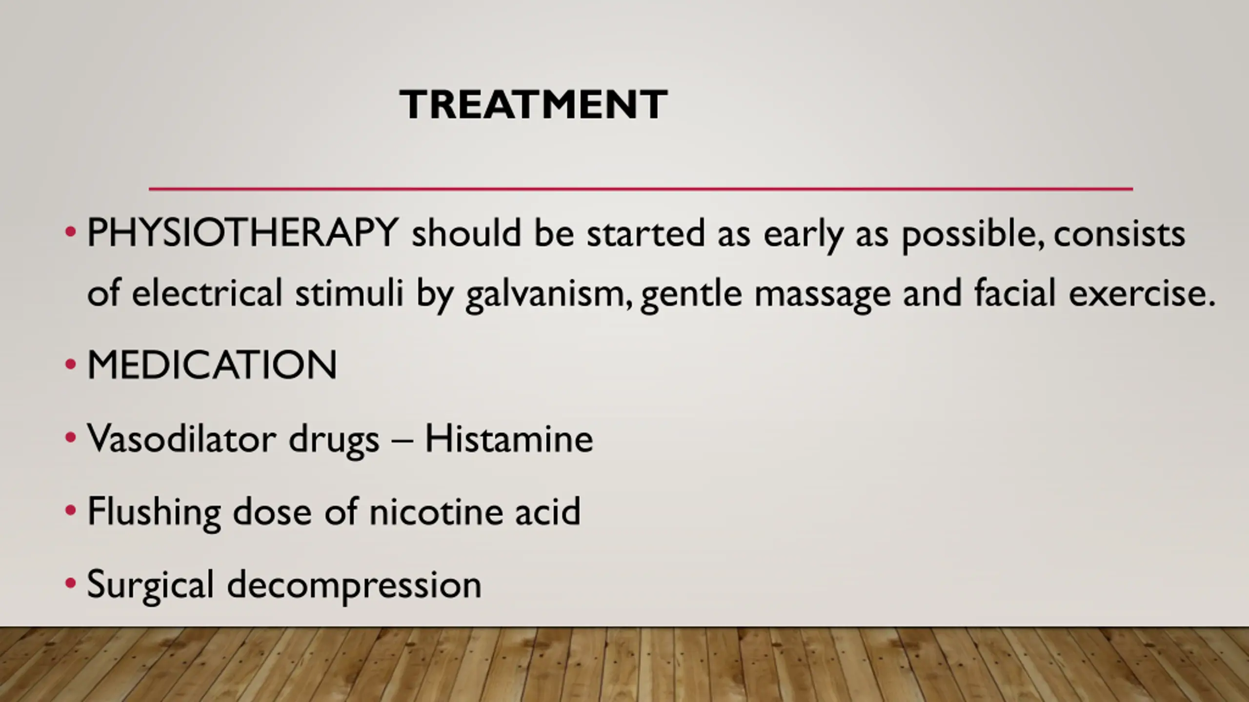 TREATMENT PHYSIOTHERAPY should be started as early as possible, consists of electrical stimuli by galvanism, gentle massage and facial exercise. MEDICATION Vasodilator drugs Histamine Flushing dose of nicotine acid Surgical decompression