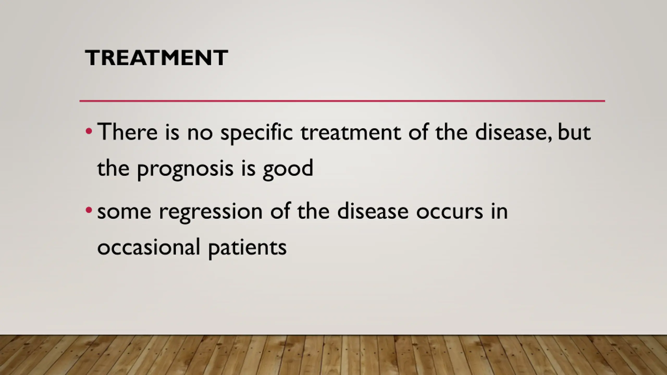 TREATMENT There is no specific treatment of the disease, but the prognosis is good some regression of the disease occurs in occasional patients
