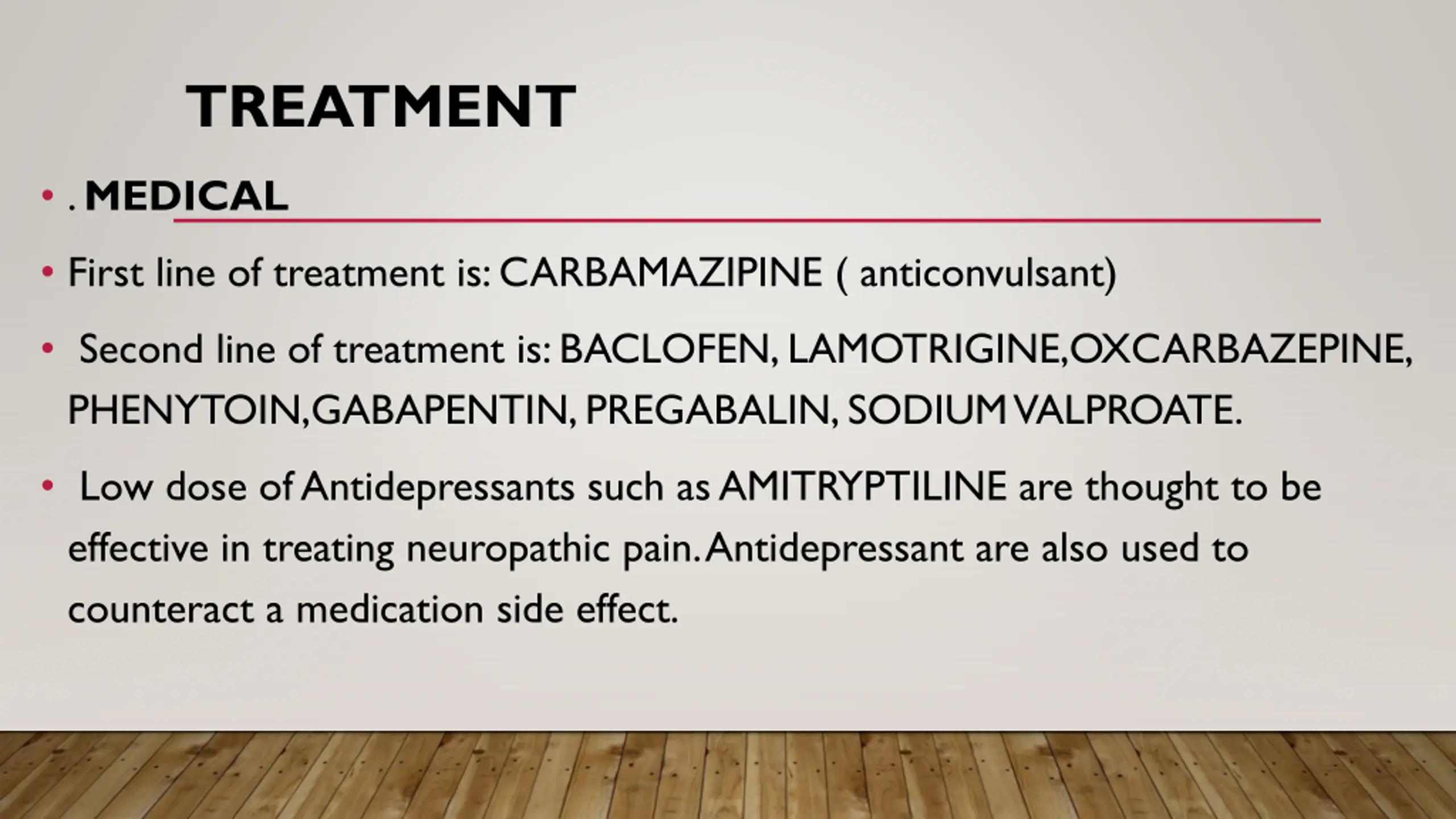 TREATMENT . MEDICAL First line of treatment is: CARBAMAZIPINE ( anticonvulsant) Second line of treatment is: BACLOFEN, LAMOTRIGINE,OXCARBAZEPINE, PHENYTOIN,GABAPENTIN, PREGABALIN, SODIUM VALPROATE. Low dose of Antidepressants such as AMITRYPTILINE are thought to be effective in treating neuropathic pain. Antidepressant are also used to counteract a medication side effect.