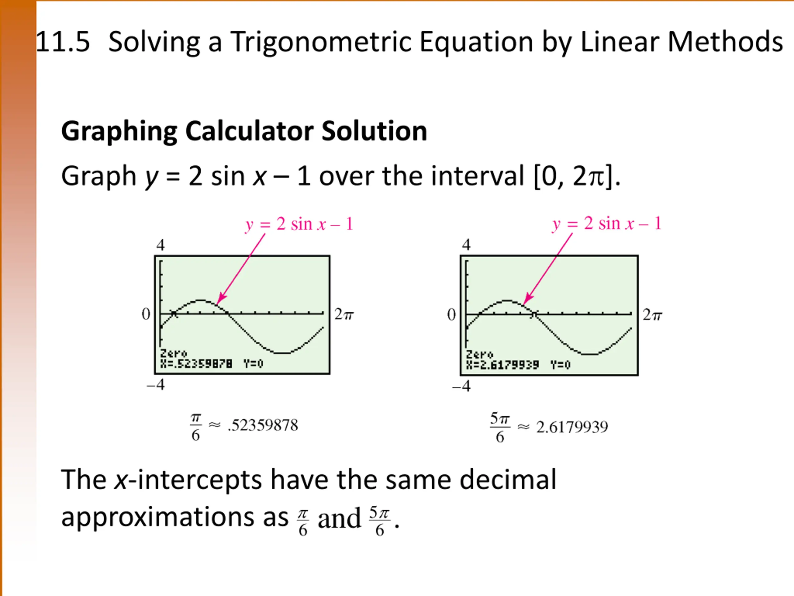 11.5 Solving a Trigonometric Equation by Linear Methods Graphing Calculator Solution Graph y = 2 sin x 1 over the interval [0, 2 ]. The x-intercepts have the same decimal approximations as 6 and6 . 5