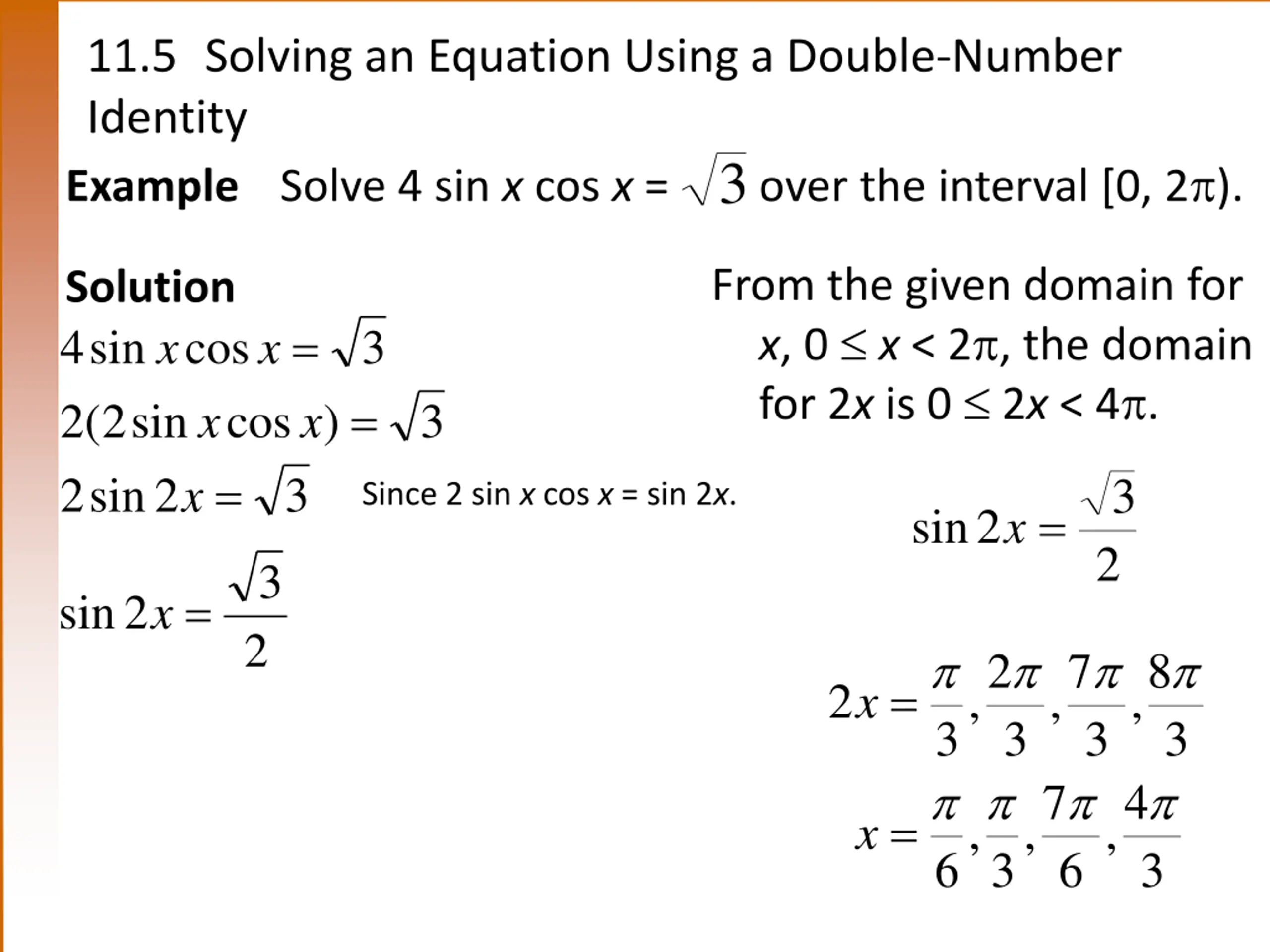 11.5 Solving an Equation Using a Double-Number Identity Example Solve 4 sin x cos x = over the interval [0, 2 ). 3 From the given domain for x, 0 x < 2 , the domain for 2x is 0 2x < 4 . Solution sin 4 sin 2 ( 2 sin 2 = x 3 cos x = x 3 = x x cos ) 3 2 3 Since 2 sin x cos x = sin 2x. = sin 2 x 2 3 = sin 2 x 2 2 7 8 = 2 , , , x 3 3 3 3 7 4 = , , , x 6 3 6 3