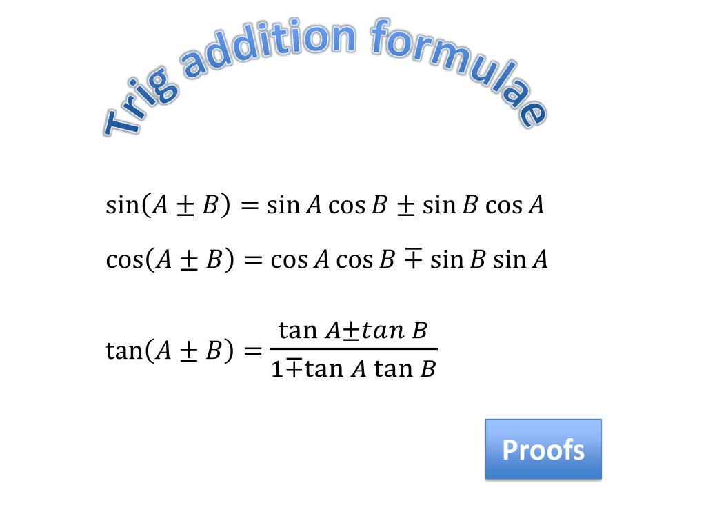 sin ? ? =sin?cos? sin?cos? cos ? ? =cos?cos? sin?sin? tan ? ??? ? 1 tan ? tan ? tan ? ? = Proofs