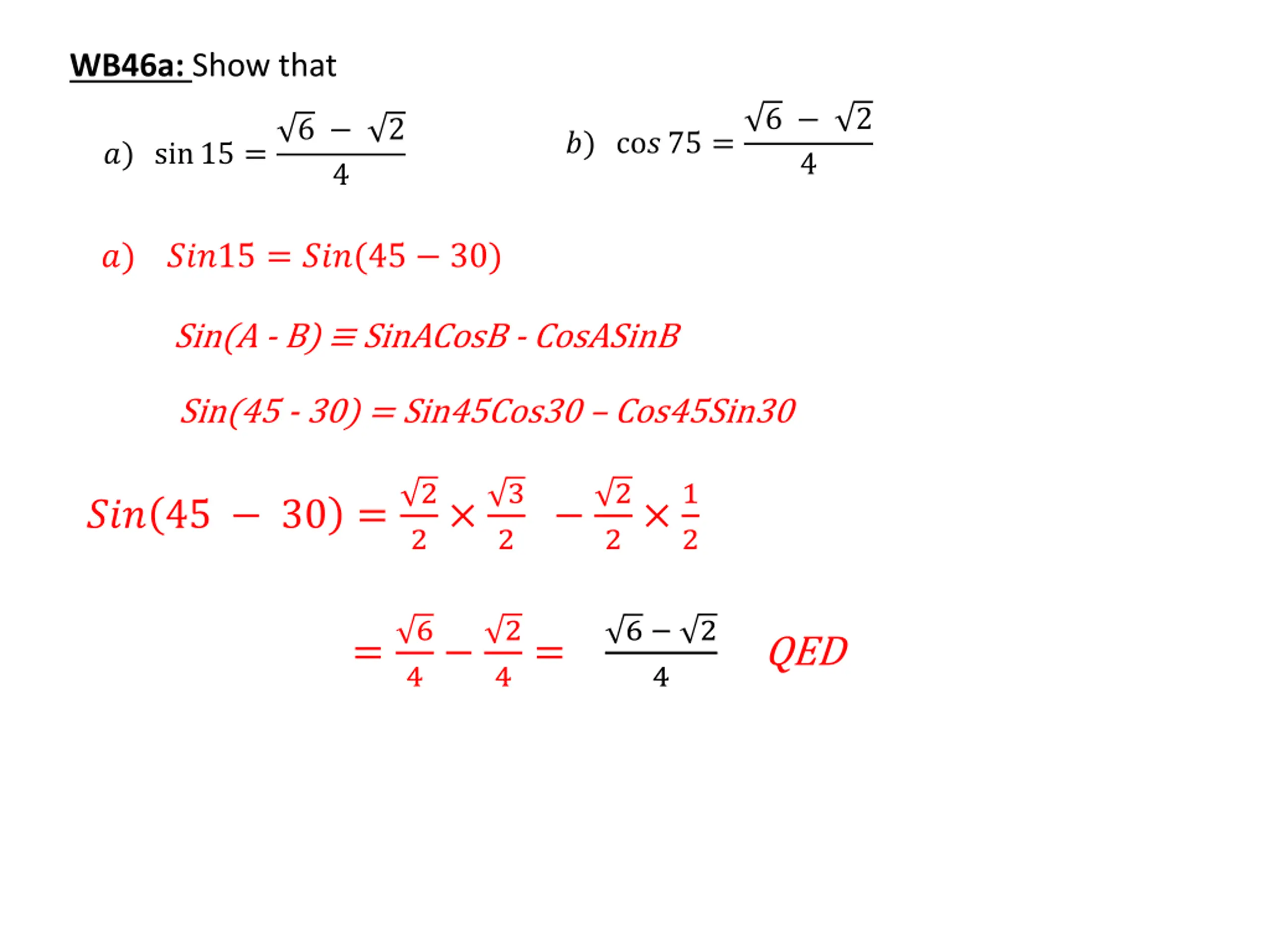 WB46a: Show that 6 2 6 2 ?) co?75 = ?) sin15 = 4 4 ?) ???15 = ???(45 30) Sin(A - B) SinACosB - CosASinB Sin(45 - 30) = Sin45Cos30 Cos45Sin30 2 3 2 1 2 ??? 45 30 = 2 2 2 6 2 6 2 4 = 4 4= QED