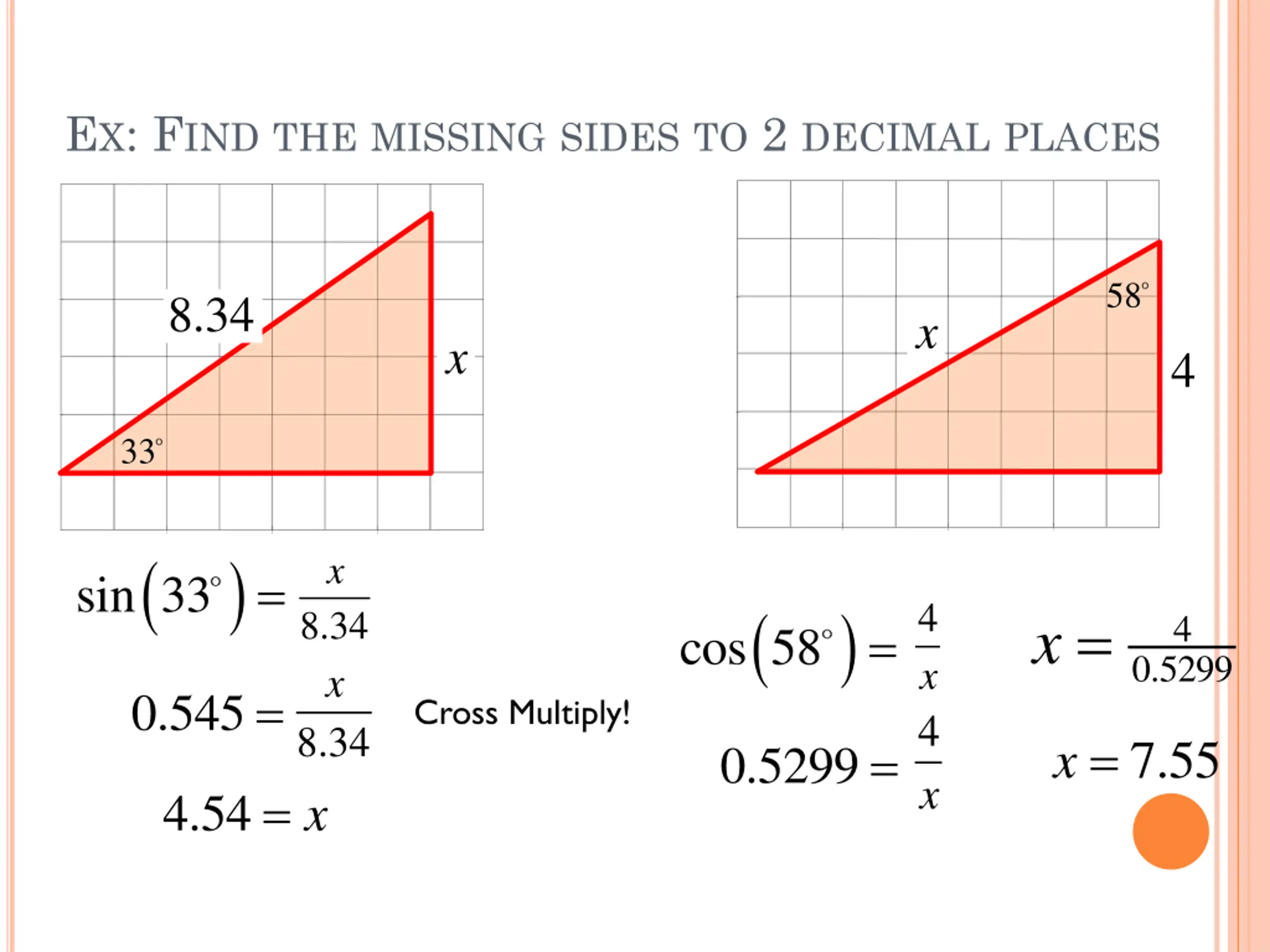 EX: FINDTHEMISSINGSIDESTO 2 DECIMALPLACES 58 8.34 x x 4 33 ( ) x sin 33 =8.34 ( ) 4 x 4 x x = 4 = cos 58 0.5299 x 0.545=8.34 4.54 Cross Multiply! x = 7.55 0.5299 = = x