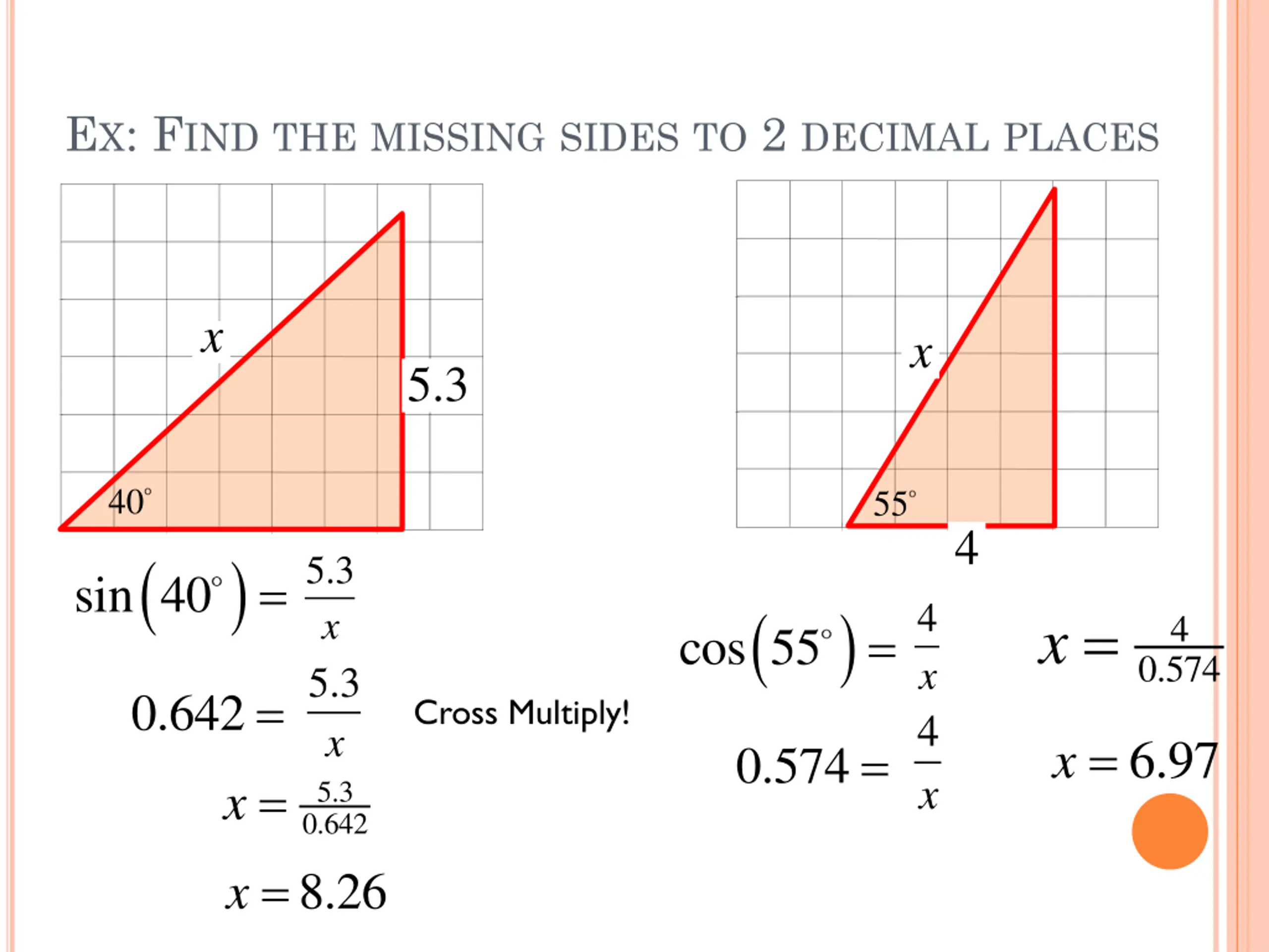 EX: FINDTHEMISSINGSIDESTO 2 DECIMALPLACES x x 5.3 40 55 4 ( ) =5.3 sin 40 ( ) 4 x 4 x x = x 4 = cos 55 0.574 5.3 x 5.3 0.642 8.26 0.642 = Cross Multiply! x = 6.97 0.574 = x = x =