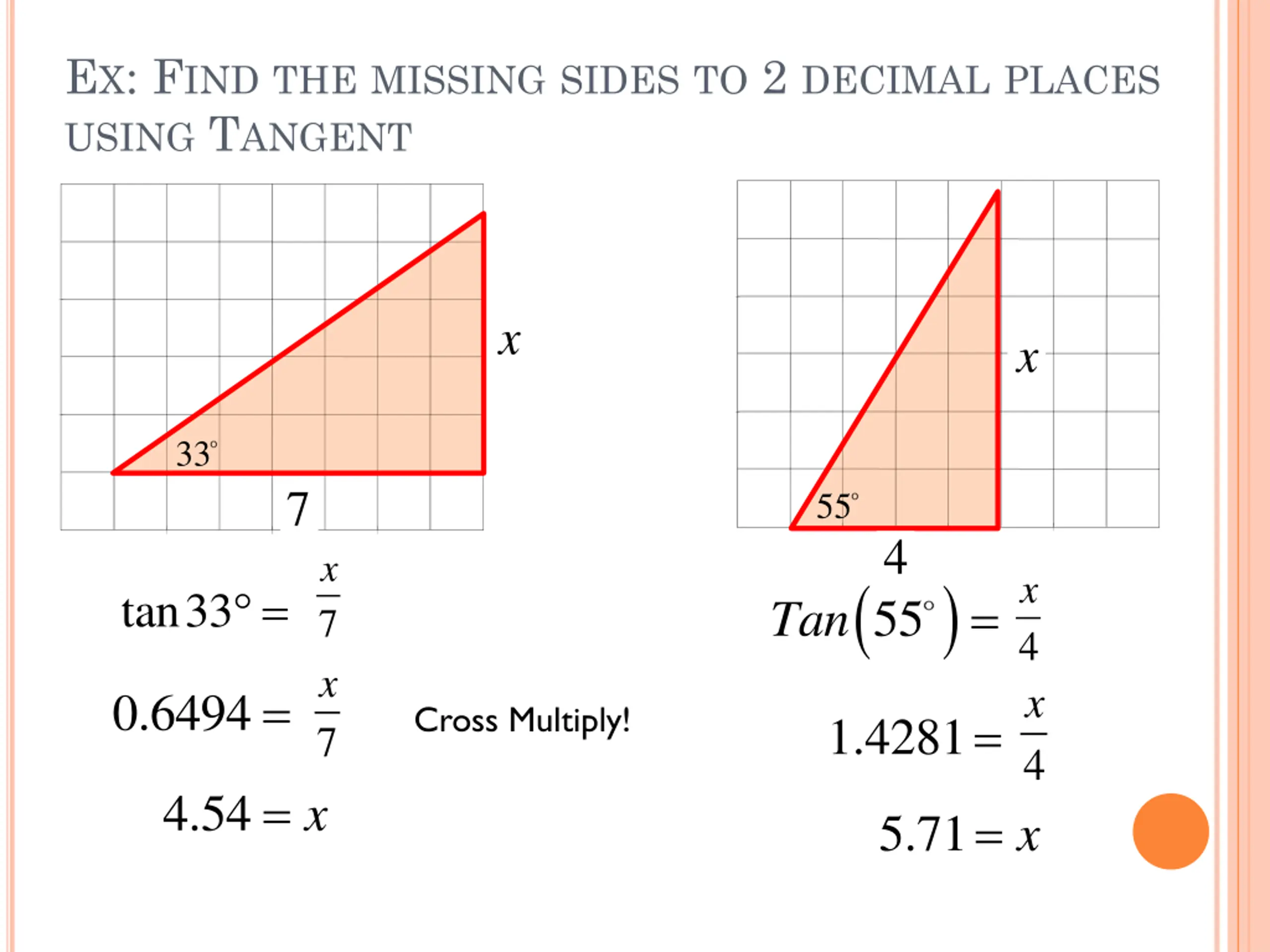 EX: FINDTHEMISSINGSIDESTO 2 DECIMALPLACES USING TANGENT x x 33 7 55 4 55 x ( ) x tan33 = =4 Tan 7 x x 0.6494 =7 4.54 Cross Multiply! 1.4281=4 5.71 = x = x