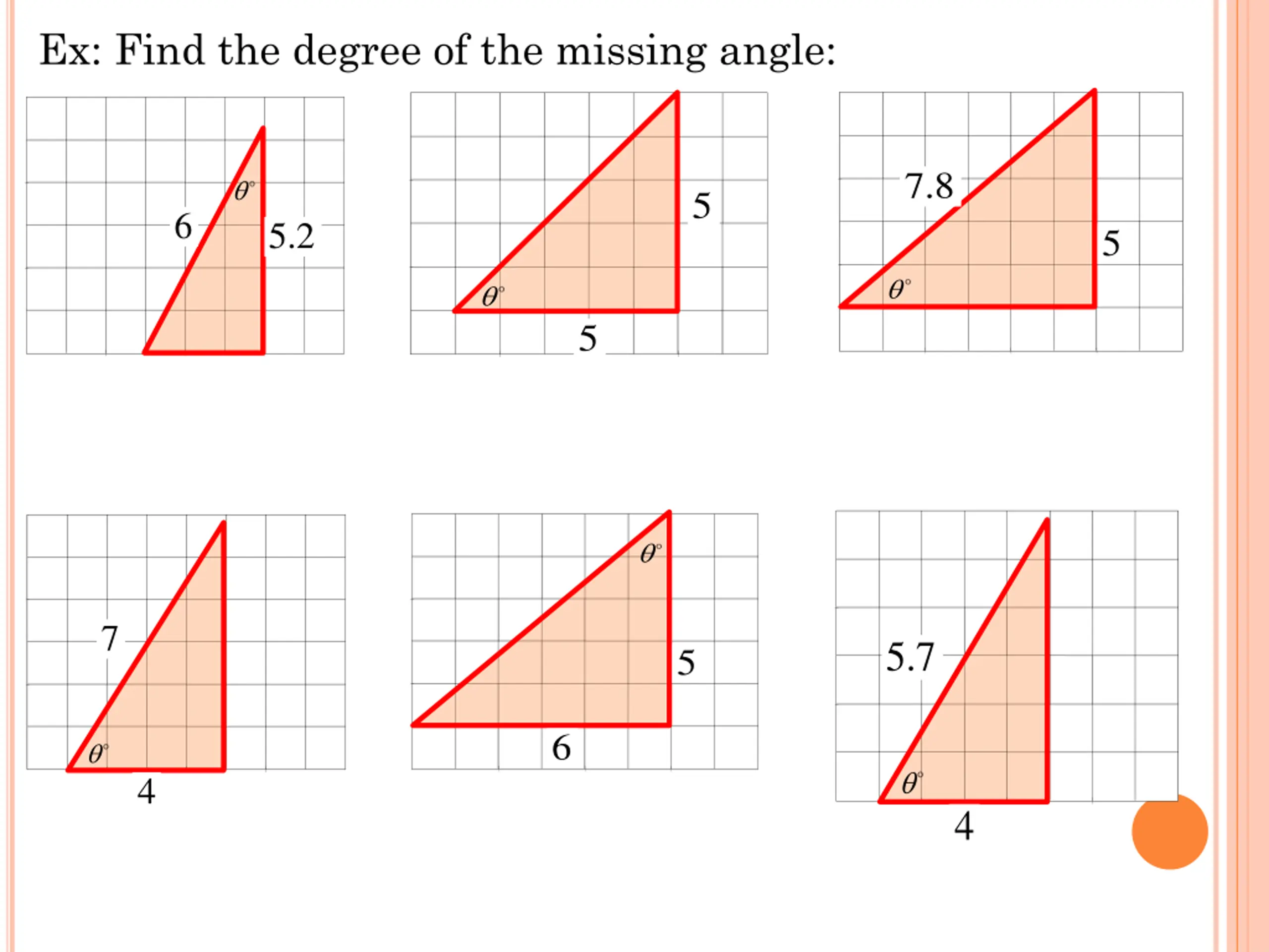 Ex: Find the degree of the missing angle: 7.8 5 6 5.2 5 5 7 5.7 5 6 4 4