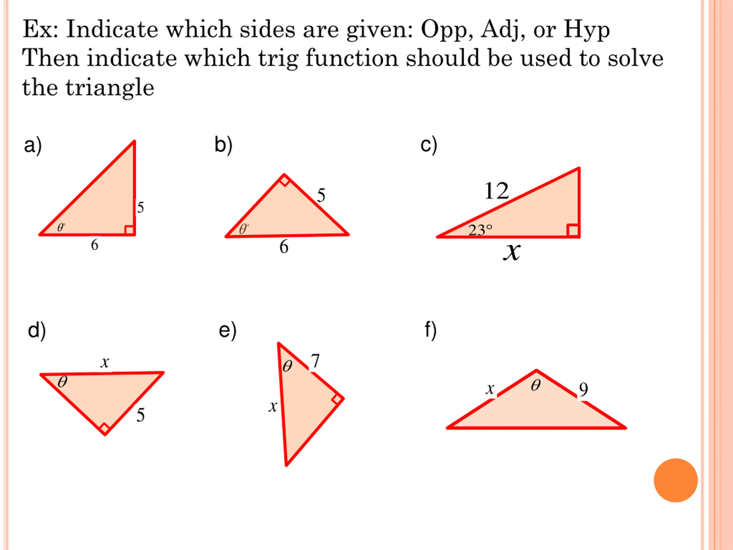 Ex: Indicate which sides are given: Opp, Adj, or Hyp Then indicate which trig function should be used to solve the triangle c) b) a) 12 5 5 23 x 6 6 f) e) d) 7 x x 9 x 5